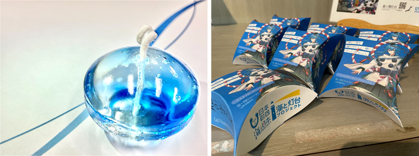 本体は水に浮くフローティングキャンドルとなっていて、楕円形のキャンドルの形は灯台のレンズをイメージし、透明と青色は海と鼠ヶ関灯台の守り人がイメージされています。