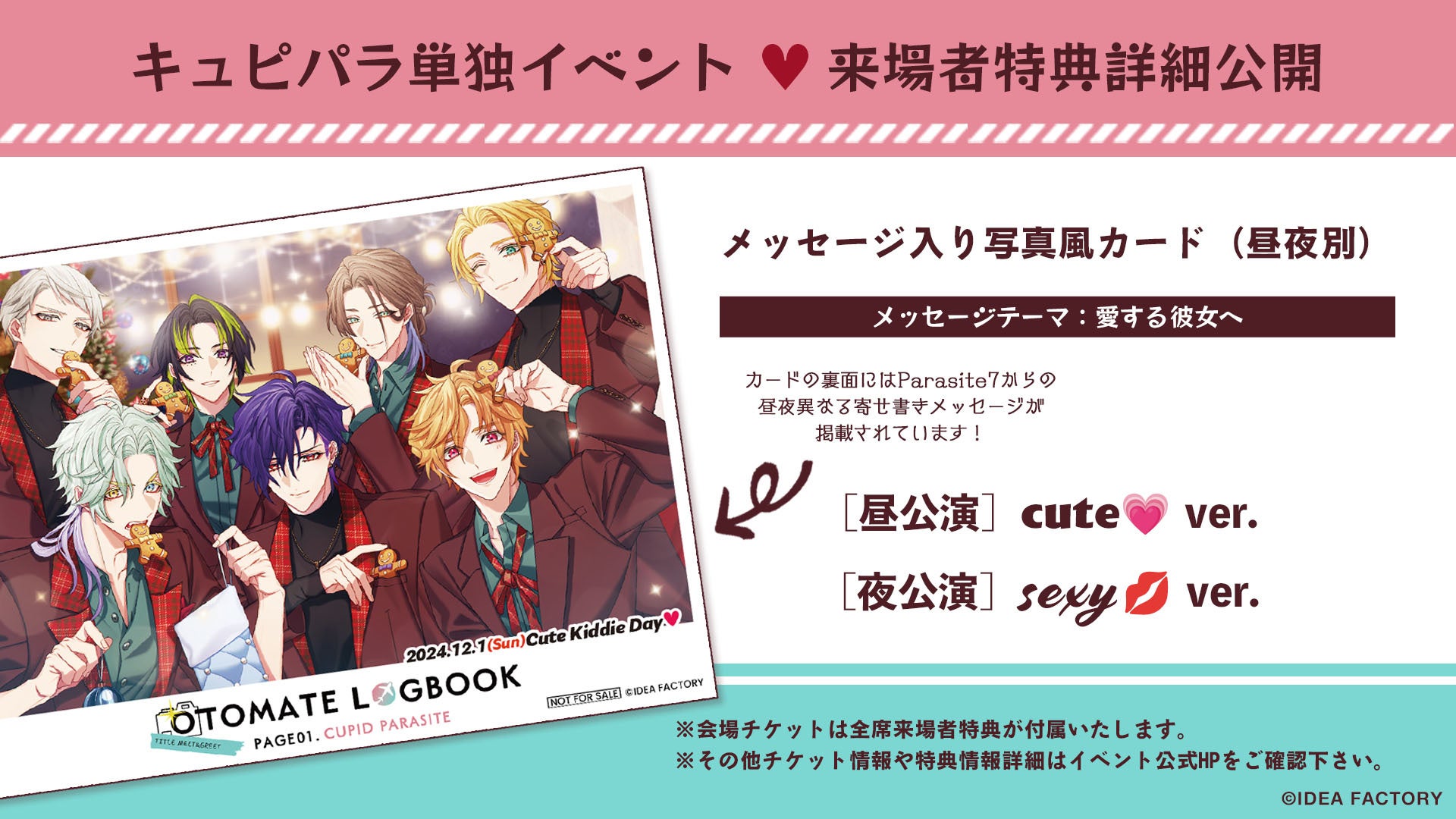 アイディアファクトリー株式会社(代表取締役社長:佐藤 嘉晃/所在地:東京都豊島区)の女性向けゲームブランド「オトメイト」は、2024年12月1日(日)に開催する単独イベントシリーズ「OTOMATE LOGBOOK PAGE01. CUPID PARASITE」の来場者特典情報詳細を公開いたしました。