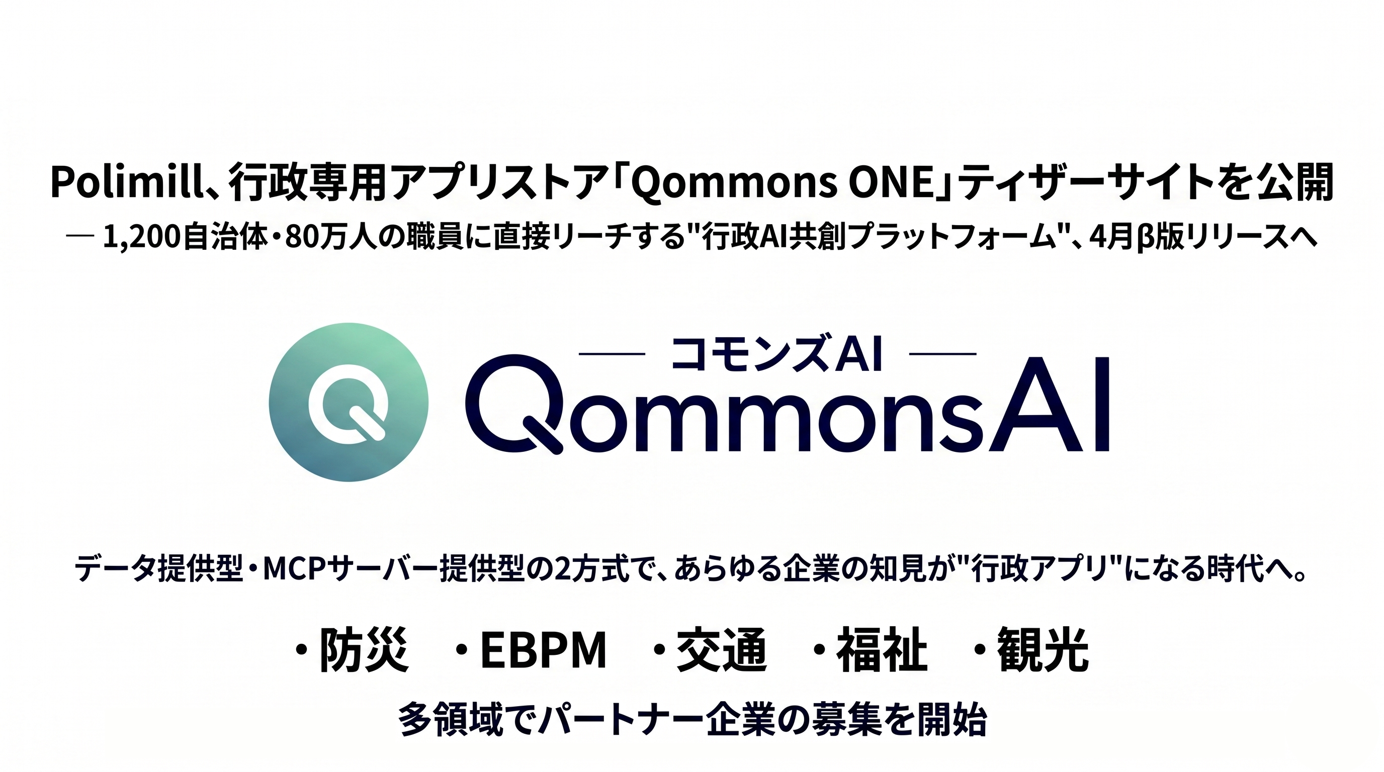 行政AXのトップランナーであるPolimill株式会社(本社:東京都港区、代表取締役:伊藤あやめ/谷口野乃花)は、行政専用アプリストア「Qommons ONE」のティザーサイトを公開し、パートナー企業の募集を本格開始したことをお知らせいたします。すでに約20社のパートナー企業候補と、データ連携・MCPサーバー連携・共同アプリ開発など多様な形態で具体的な検討を進めており、一部企業はすでにアプリ開発に着手しています。自治体側からも現時点で約300自治体が利用の意向を示しています。Qommons ONEは2026年4月にβ版、6月に正式版のリリースを予定しています。