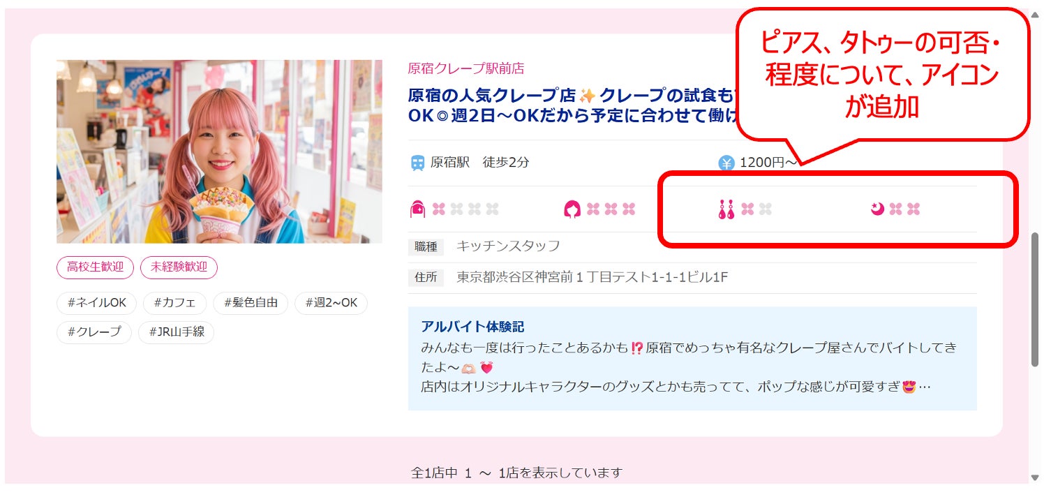 業務中にピアスOKなお店を検索できる機能です。さらに、ピアスが1個までOKか、複数OKかまでアイコンで表示しています。