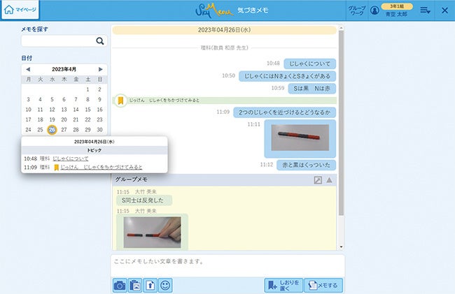 子どもたち同士で意見を出し合う場面などでは、グループ内で「気づきメモ」を共有できます。個人で書きとめたメモの中から共有したいものを選んで共有し、考えを伝えながら協働で学びを深めることができます。