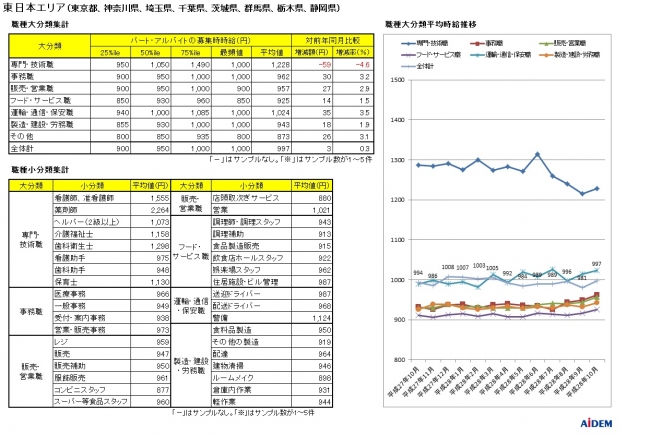 - 東日本エリア全体の平均時給は、前年同月比3円増の997円
