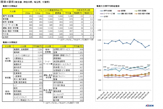 都県別の平均時給は、東京都1,056円(前年同月比1円増)、神奈川県1,051円(同12円増)、千葉県990円(同26円増)、埼玉県968円(同3円増)の順で、前年同月比ですべての都県がプラスとなった。