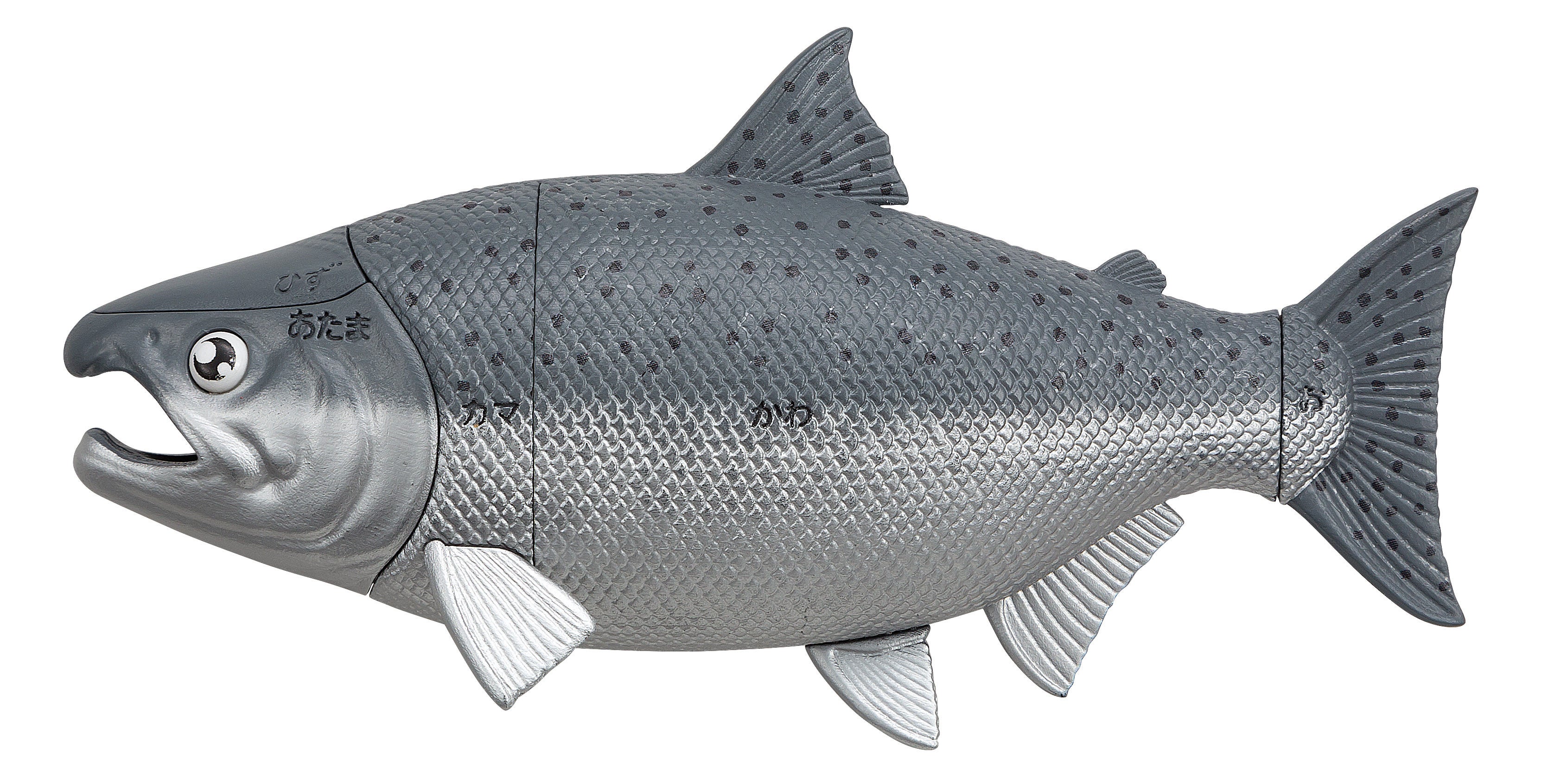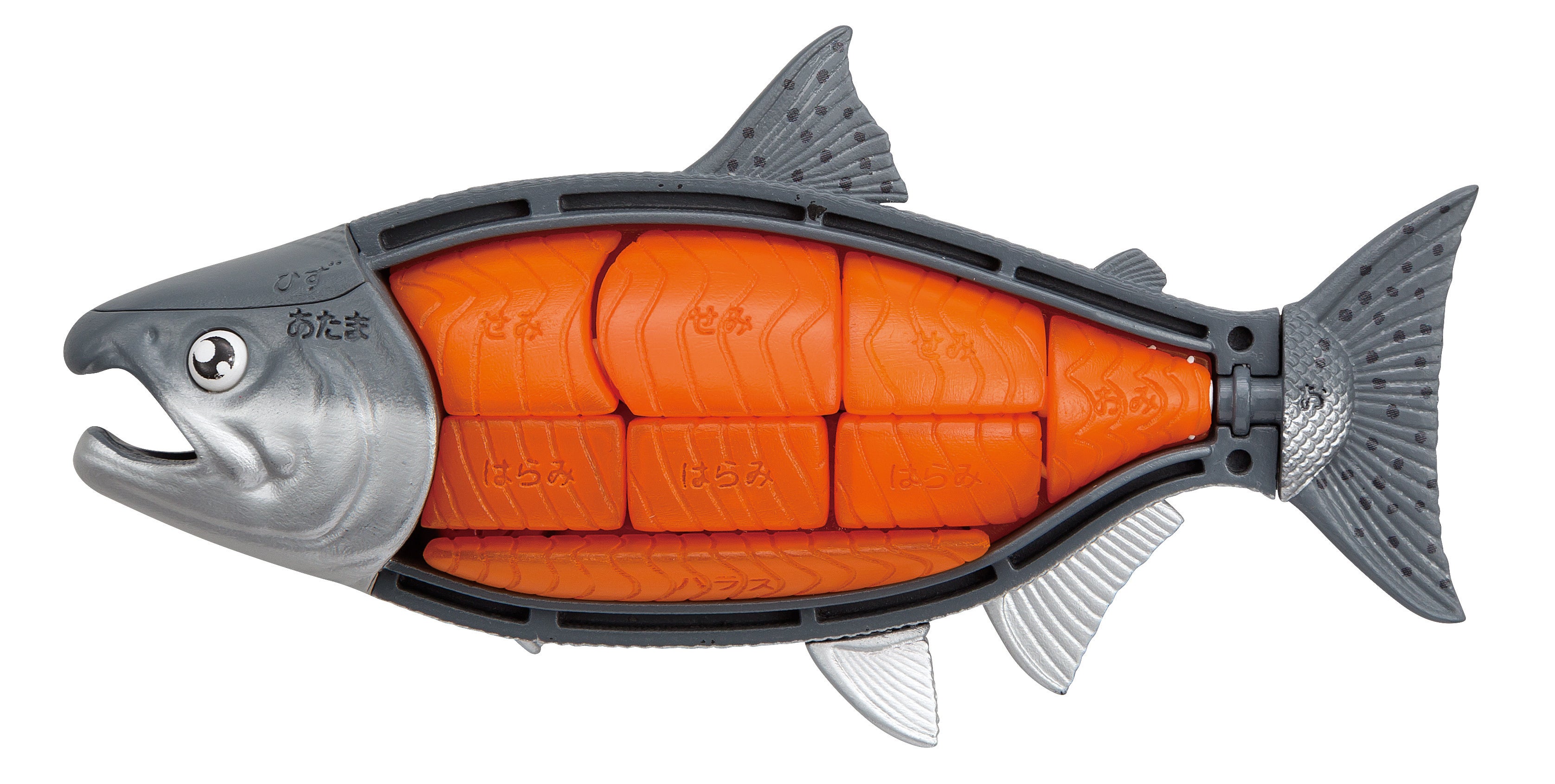 「一本買い!!キングサーモン解体パズル」は、キングサーモンの部位がわかる立体パズルです。全34パーツの構成で、“はらみ”等のお馴染みの部位から“ハラス”や“すじこ”の希少部位パーツもあります。部位を組み合わるパズルとして遊ぶのはもちろん、包丁で解体したり、付属のシャリパーツに“すじこ”や“せみ”をのせてお寿司作り、まな板シートや台座で飾ることもできます。