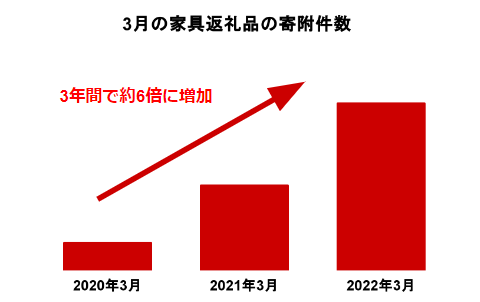 「ふるなび」では約2万点にのぼる家具カテゴリーの返礼品を掲載しており、2020年〜2022年の3月における当カテゴリーへの寄附は3年間で6倍に増加しています。