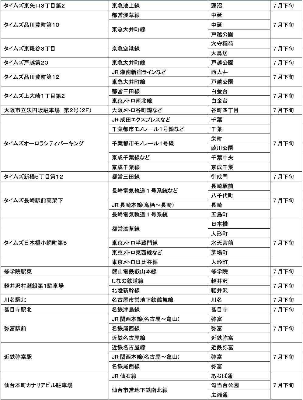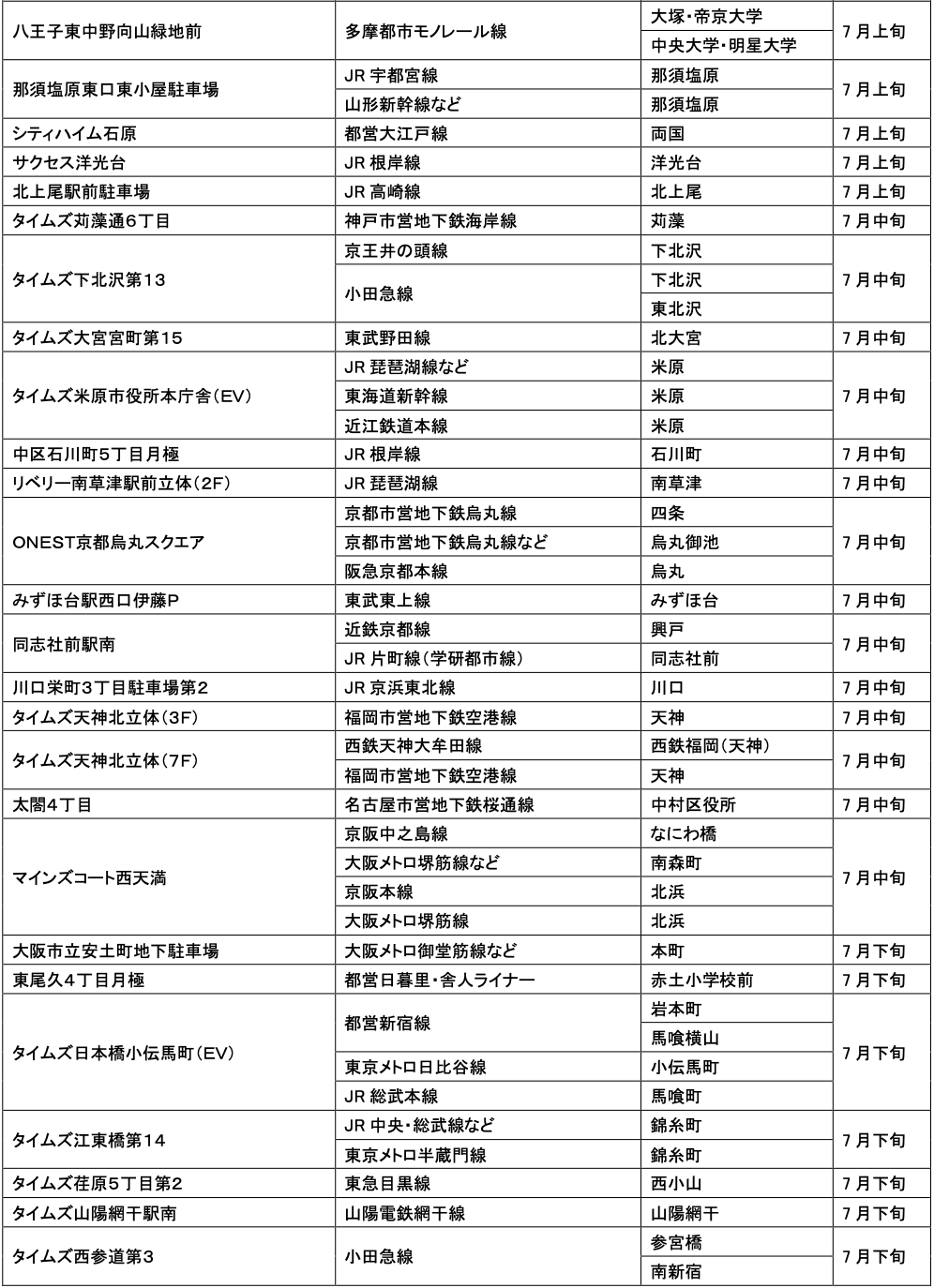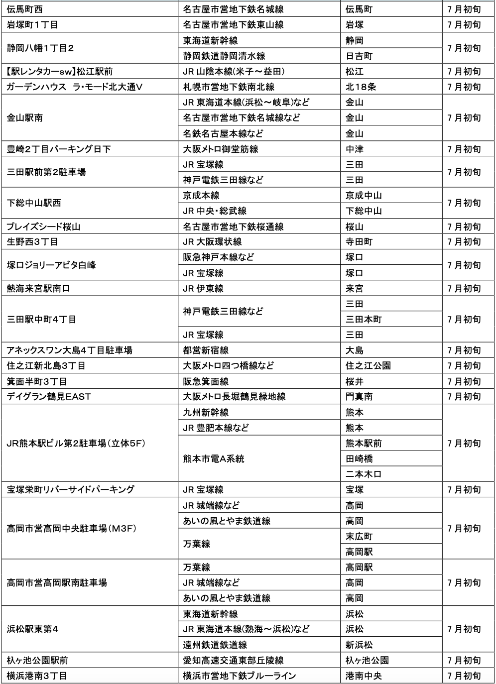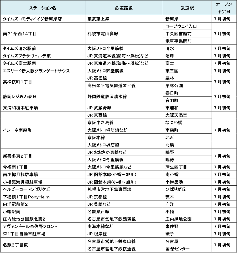 7月にオープンおよびオープン予定の「パーク&ライド」が可能な駐車場は21件、「レール&カーシェア」が可能なステーションは156件です。