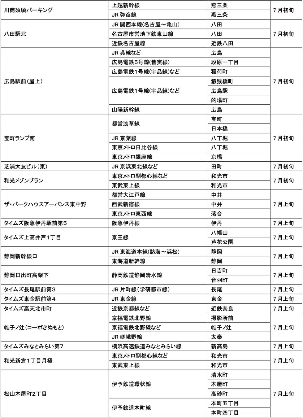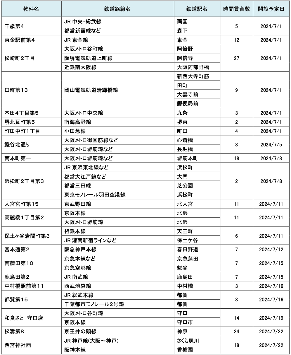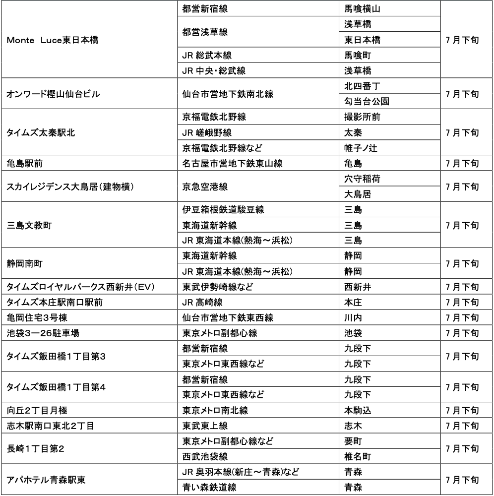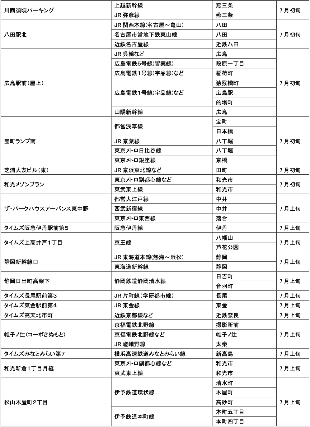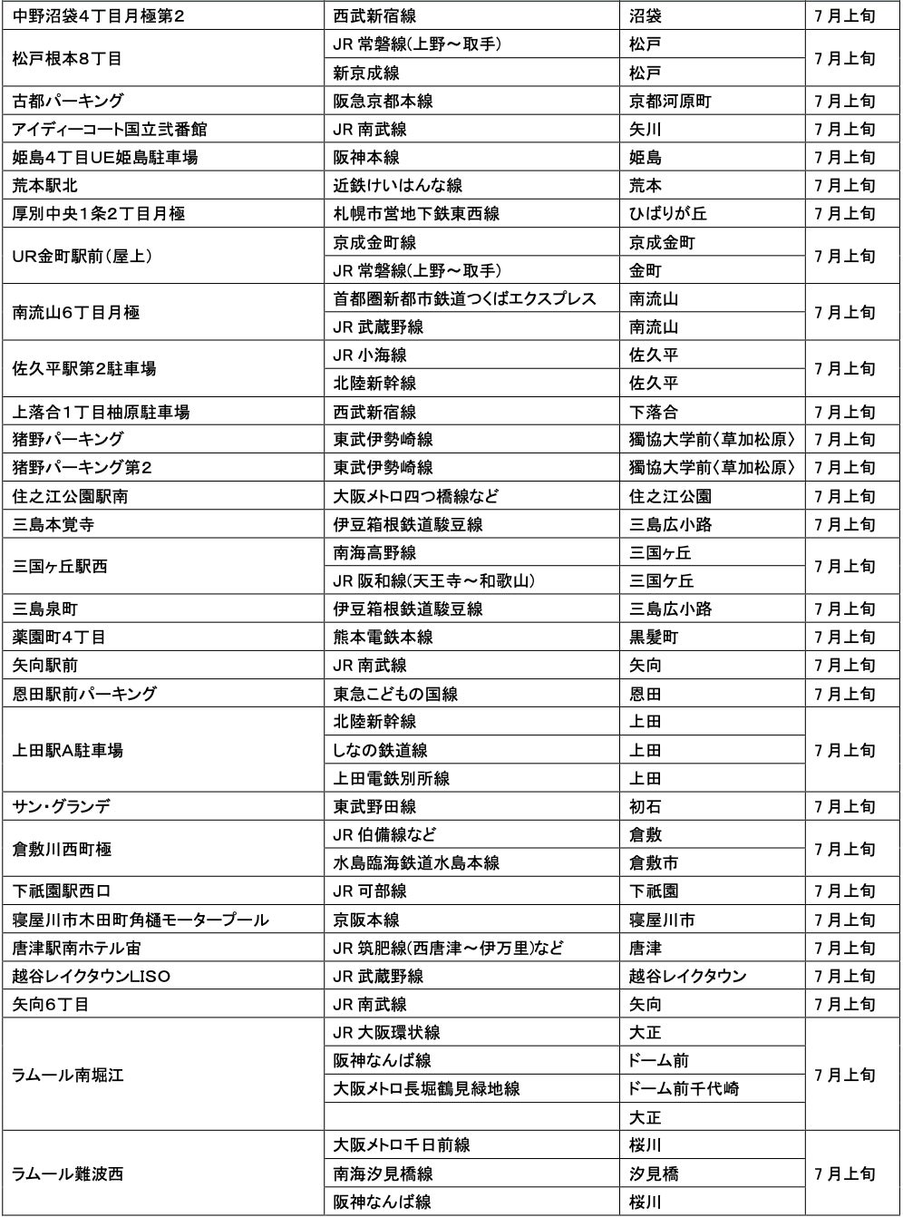 7月にオープンおよびオープン予定の「パーク&ライド」が可能な駐車場は21件、「レール&カーシェア」が可能なステーションは156件です。