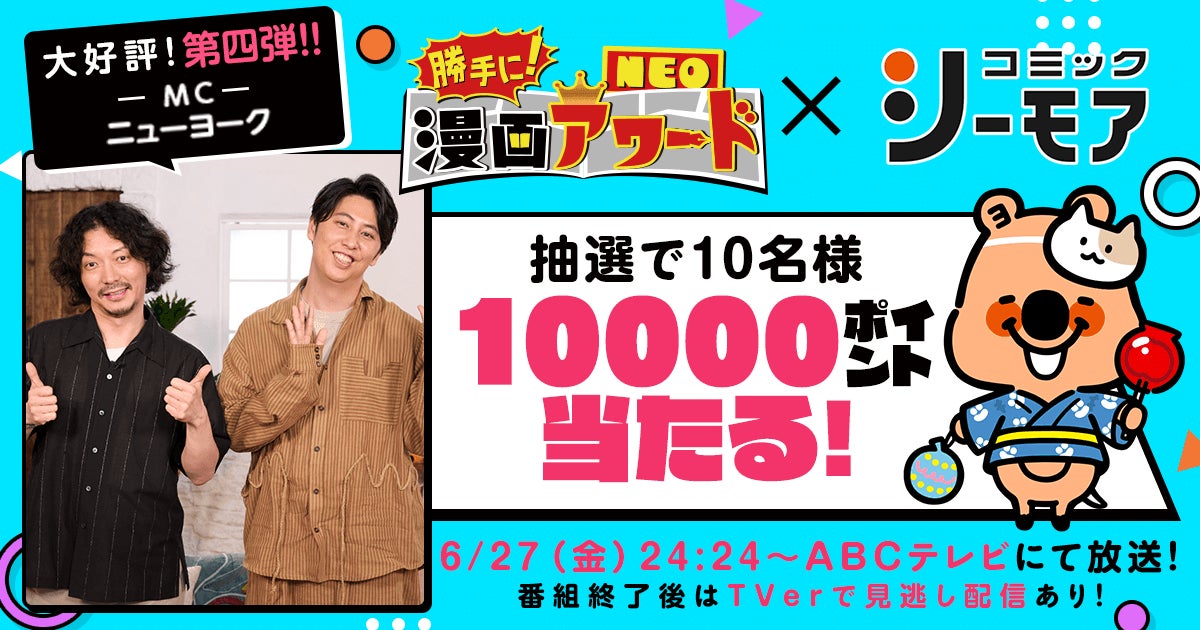 エヌ・ティ・ティ・ソルマーレ株式会社(本社:大阪市中央区、代表取締役社長:朝日利彰、以下 NTTソルマーレ)が運営する、国内最大級の総合電子書籍ストア「コミックシーモア」は、過去の放送が好評だった『勝手に!漫画アワードNEO』(ABCテレビ)の2025年6月27日(金)24時24分~に特別提供いたします。さらに、漫画好きのニューヨークをはじめ、豪華ゲストがおすすめする漫画をお得に読める放送記念キャンペーンを実施いたします。