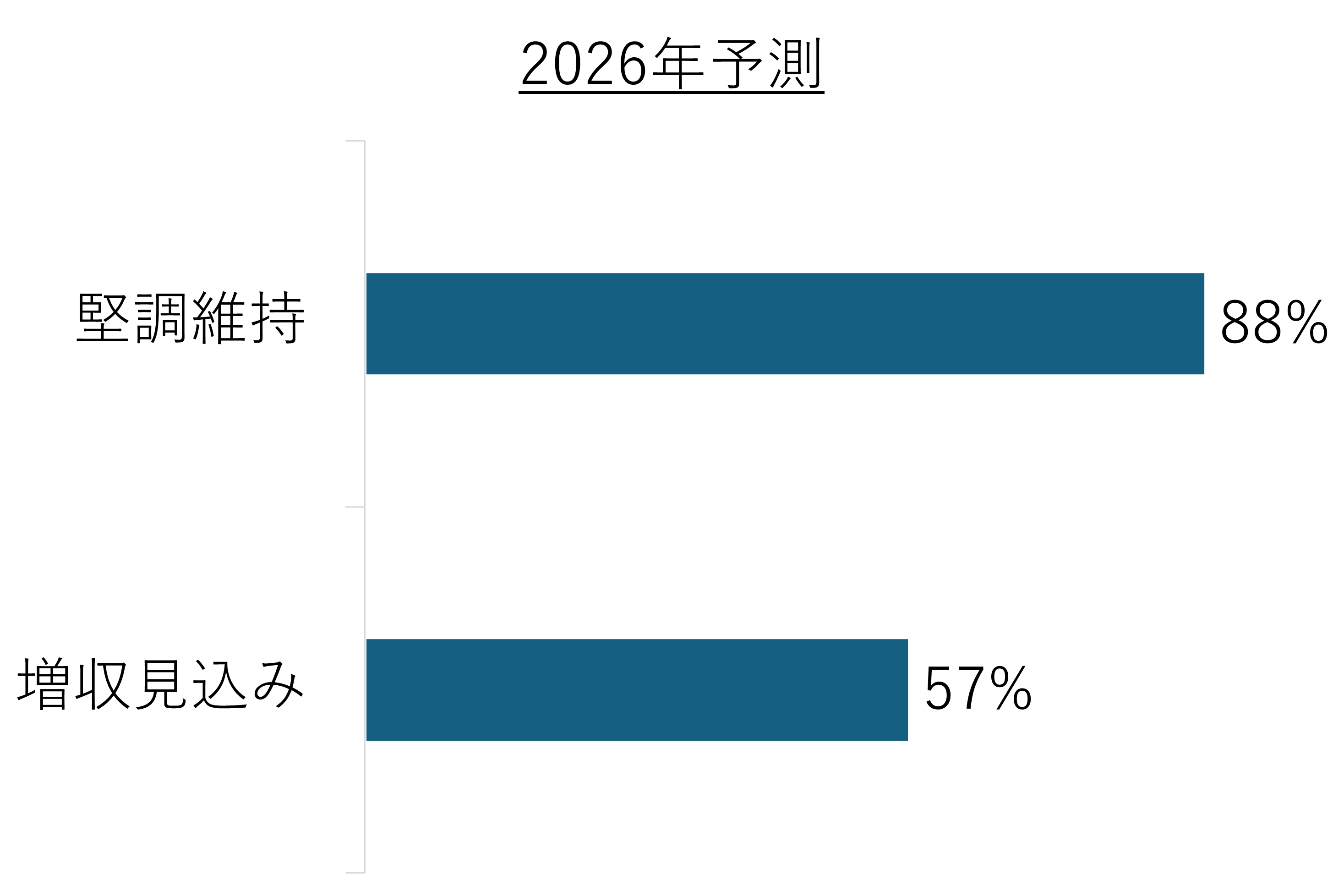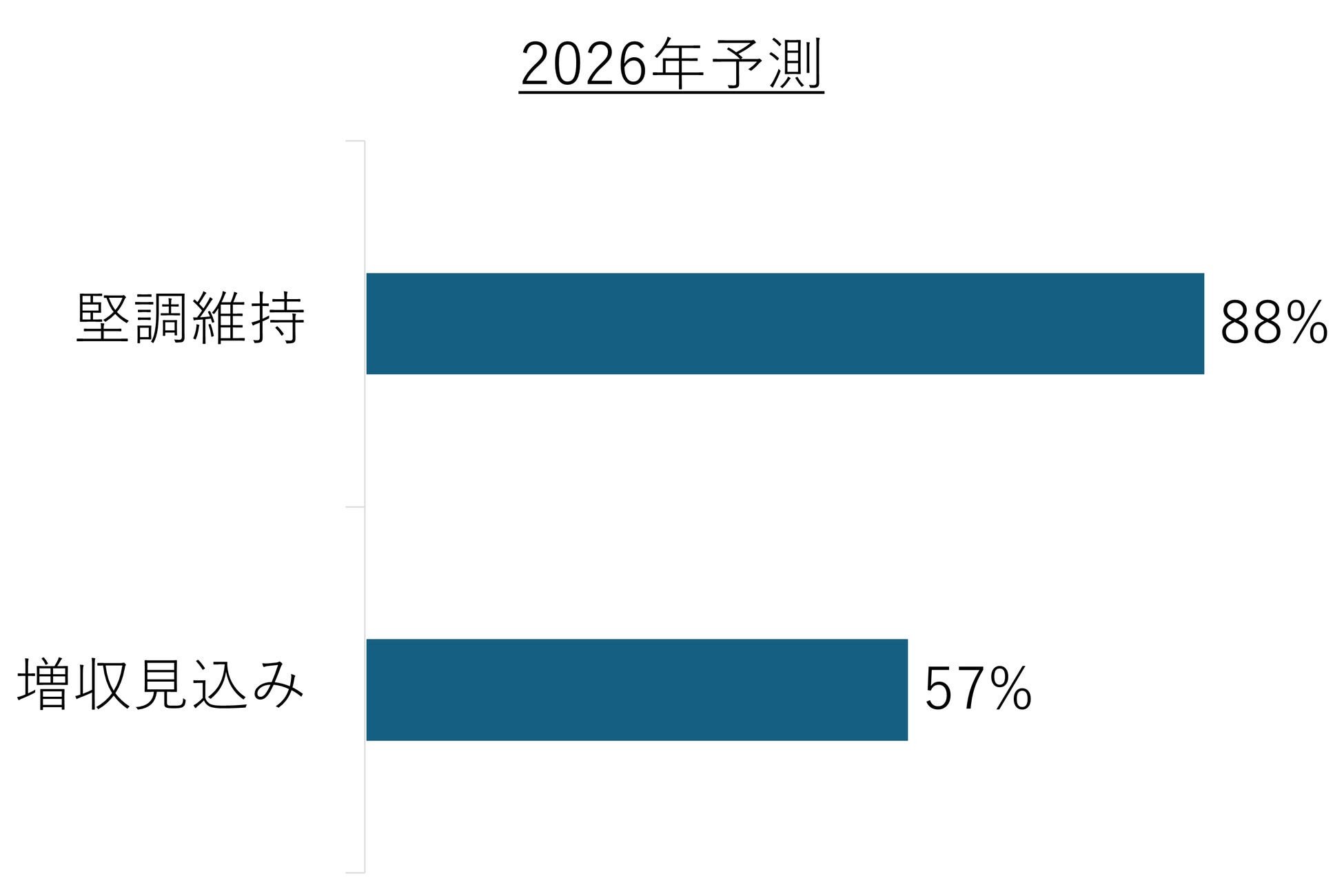 2026年は増収見込みや堅調維持などポジティブな傾向が見られる一方、コスト高騰や人手不足は全業態において依然として課題であることが伺えます。