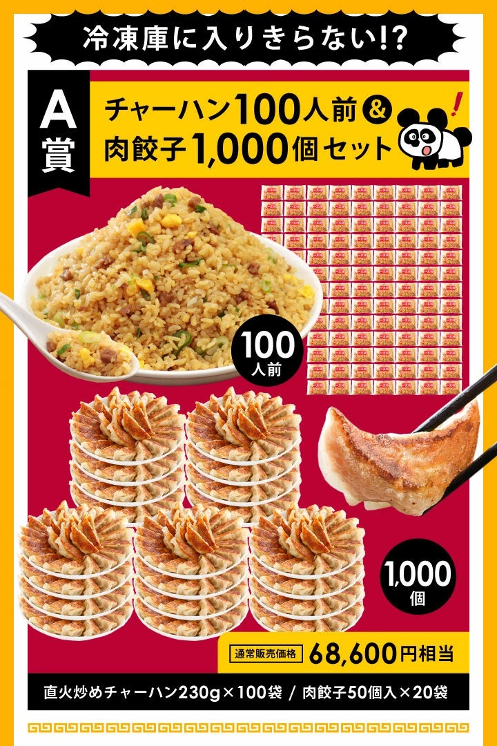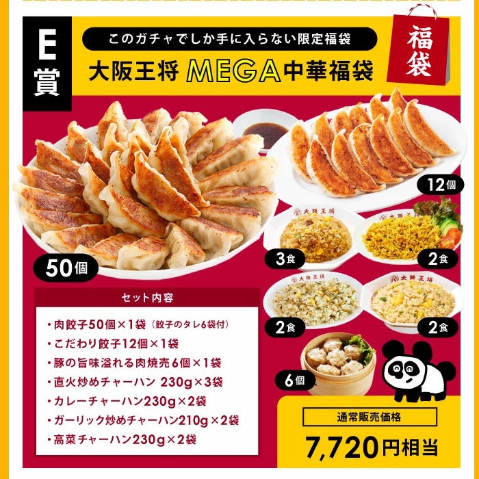 餃子や炒飯をはじめとした人気の中華惣菜各種(単品・セット)が最大半額以下で購入できるほか、大阪王将「直火炒めチャーハン」を1円で購入できるクーポンをプレゼントいたします(会員様限定)。また、5,500円で最大68,600円相当の中華惣菜セットが当たる「MEGA中華ガチャ」も販売いたします。