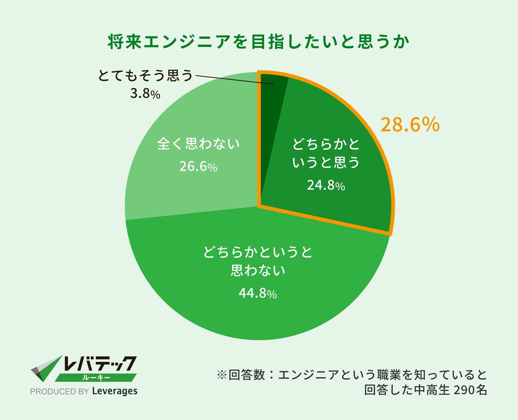 エンジニアという職業を知っている*1と回答した中高生に対して、「エンジニアという職業を目指したいと思うか」聞いたところ、「とても思う(3.8%)」「どちらかというと思う(24.8%)」という回答が合わせて28.6%となりました。エンジニアという職業を知っている*1と回答した中高生の約4人に1人が、将来エンジニア職を目指すことについてポジティブに考えていることがわかります。