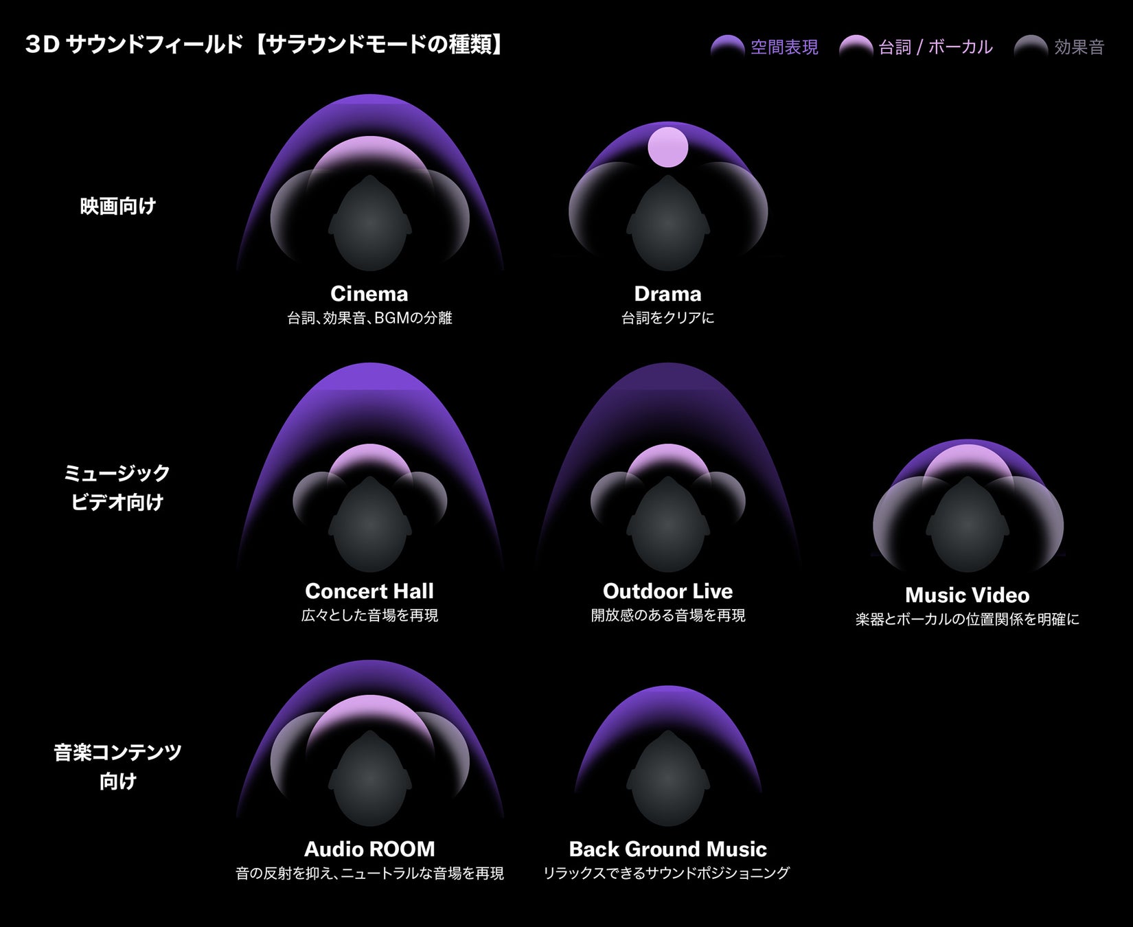 ・あらゆるコンテンツを3次元音場で再現し、最適な音場で楽しめる「3Dサウンドフィールド」
