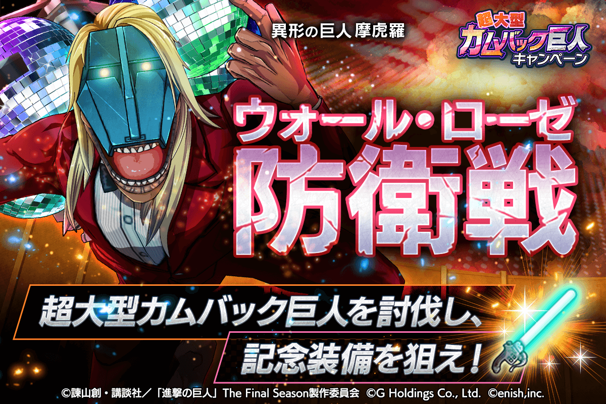 株式会社enish(本社:東京都港区、代表取締役社長:安徳 孝平、以下enish)は、アニメ『進撃の巨人』のスマートフォンゲーム最新作「進撃の巨人Brave Order」にて、2月4日(土)より「超大型カムバック巨人キャンペーン」を開催!当キャンペーンではログインするだけで「限界MAXカムバックガチャ」が最大100連無料!当ガチャでは★6キャラクターなら限凸MAX熟練度+10が確定!さらに「ウォール・ローゼ防衛戦」には期間限定で「異形の巨人 摩虎羅」 が登場!さらにさらに、戦術スタイルLv180まで獲得経験値が4倍のブーストや限定武器が獲得可能なSPミッションも同時開催!その他、最新情報はゲーム公式サイト・ゲーム公式Twitterアカウントにて随時公開して行きますので、ぜひご覧ください。