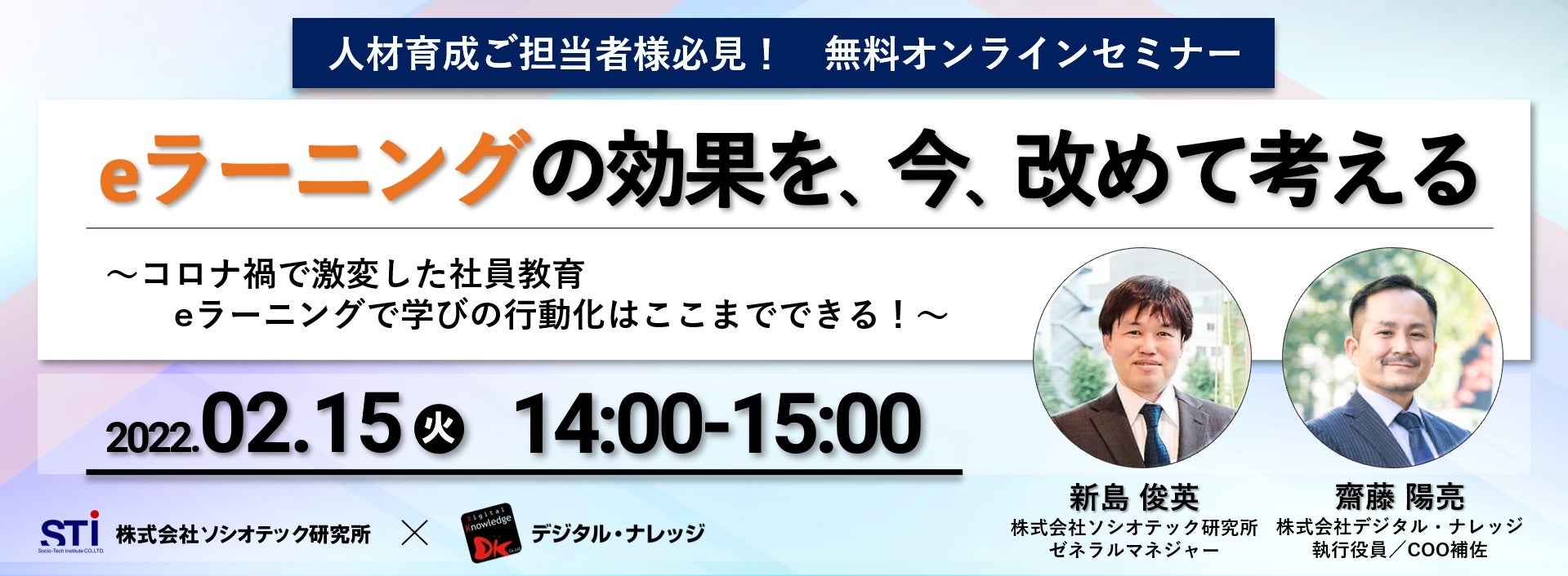 導入実績2000超を誇るeラーニング専門ソリューション企業、株式会社デジタル・ナレッジ(本社:東京都台東区、代表取締役社長:はが弘明)は、経営・組織課題の解決を支援する株式会社ソシオテック研究所様(本社:東京都千代田区、代表取締役:廣川真一)との共催セミナーを2022年2月15日に開催いたします。