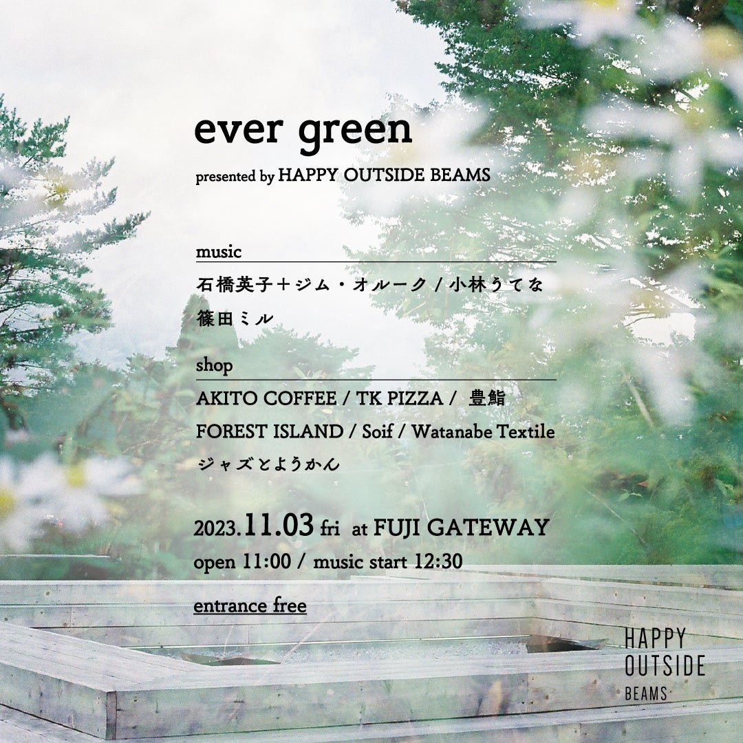 株式会社ビームス(本社:東京都渋谷区、代表取締役社長:設楽洋、以下ビームス)は、ビームスが掲げる外遊び促進プロジェクト「HAPPY OUTSIDE BEAMS」企画による自然と音楽を楽しむために提案するイベント『ever green presented by HAPPY OUTSIDE BEAMS』を、11月3日(金・祝)に山梨県富士山麓に位置するアドベンチャー複合施設「FUJI GATEWAY」を舞台に、入場無料で開催します。