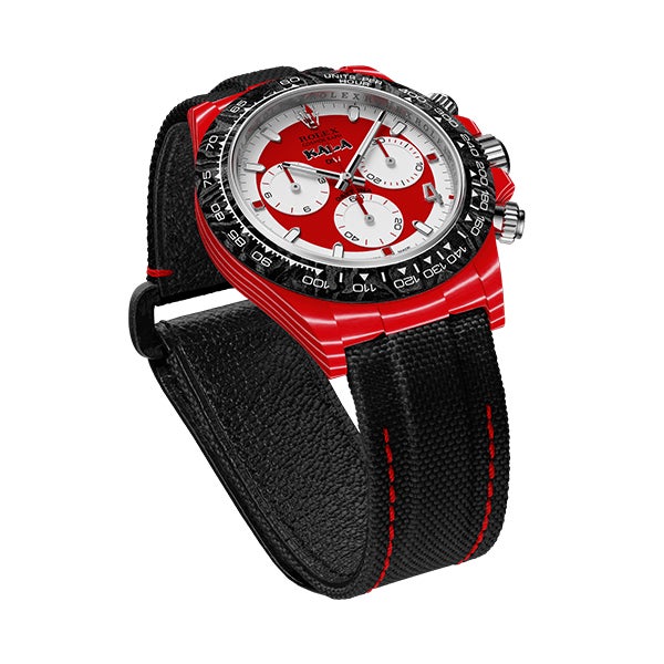 ケースには、軽量かつ耐久性に優れた赤色のクォーツファイバーを採用し、ベゼルにはカーボンファイバーを使用。両方の素材は、見た目に独特の質感やパターンがあり、デザインに個性を与えます。カーボンファイバーの織り目模様やクオーツファイバーの滑らかな仕上げが視覚的に魅力的で、技術的な印象を与えることができます。また、ジョージア国旗をモチーフにしたデザインが施され、洗練されたスポーティーな印象を与えています。