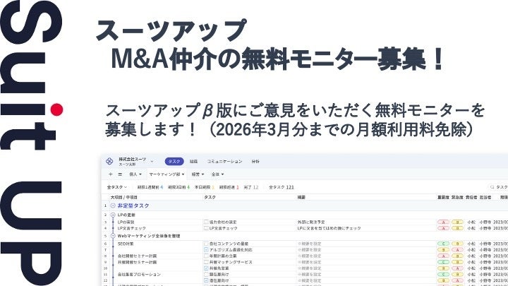 株式会社スーツ(所在地:東京都千代田区、代表取締役社長CEO:小松 裕介)は、AIでかんたん、チームのタスク管理・プロジェクト管理ツール「スーツアップ」において、M&A仲介の無料モニターを募集いたします。
