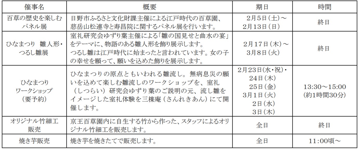 また、京王百草園オリジナル竹細工や焼き芋の販売も行います。さらに、新規企画としてひなまつりの原点ともいわれ、無病息災の願いを込めて楽しむ雛流し(ひなながし)のワークショップも開催します。