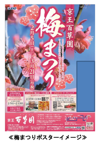 京王電鉄株式会社(本社:東京都多摩市、取締役社長:紅村 康)が運営する「京王百草園」(住所:東京都日野市百草560)では、2月5日(土)から3月21日(月・祝)まで、恒例の「梅まつり」を開催します。