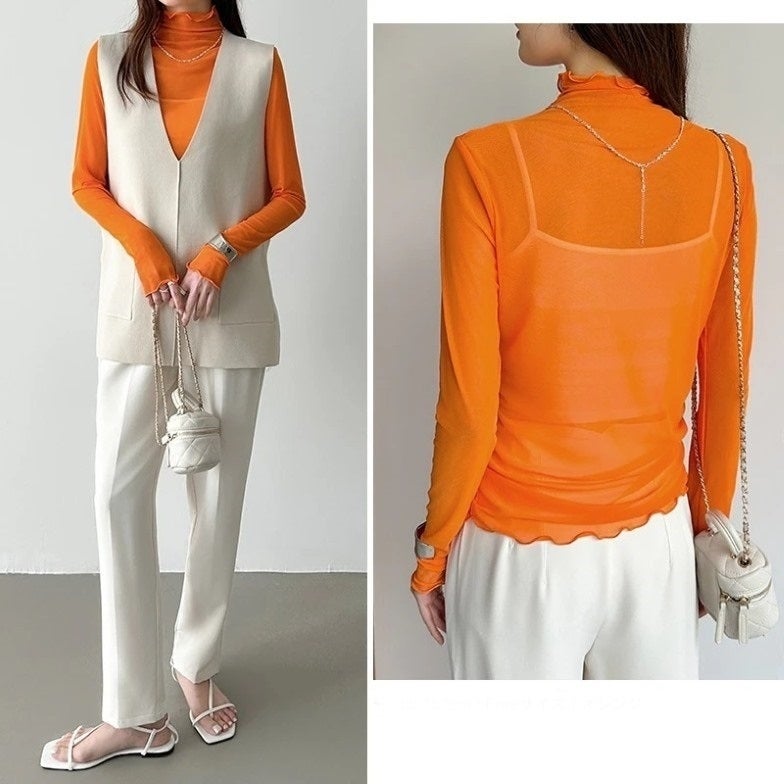 ハイネックデザインと伸縮性のある細身のシルエットがボディラインをスッキリと見せてくれる。ビタミンカラーを含む15色展開。