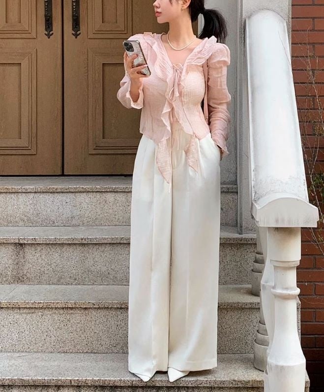 鎖骨の華奢見えが叶うフリルのVネックデザインとふんわり袖がレディライクな一枚。白のワイドパンツ&パンプスでオケージョンシーンにも。