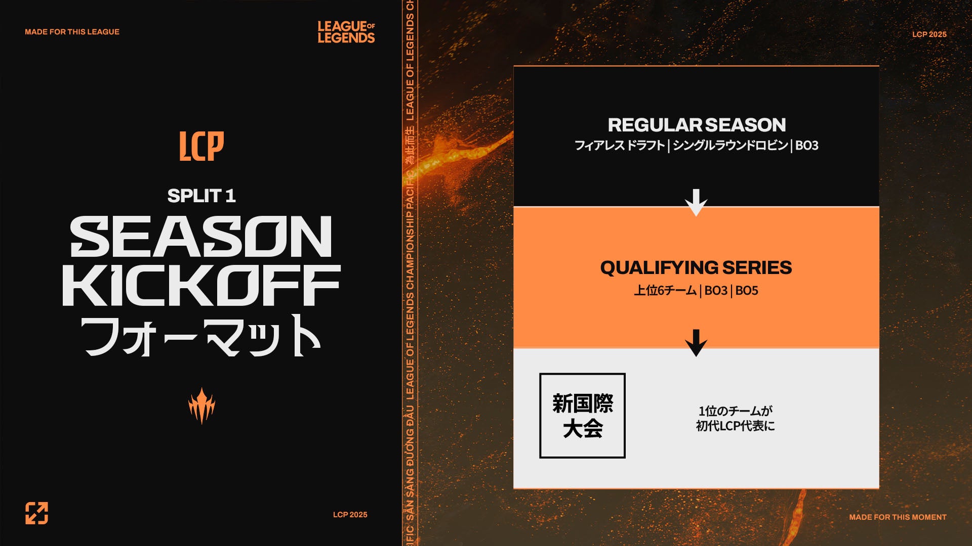 2025シーズンはSeason Kickoff、Mid Season、Season Finalsという3つのスプリットから構成されます。国際大会出場権を獲得できるのは、各スプリットで優れた成績を残した各リーグのチームのみ。また、Season Finalsの優勝チームはシーズンのLCP王者となります。