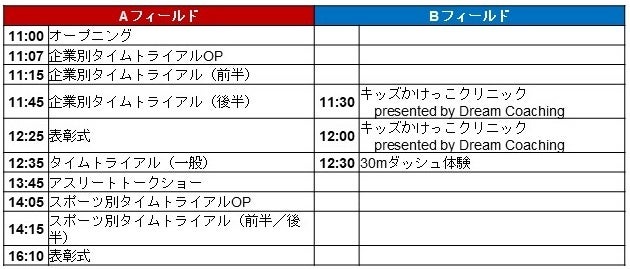 スポーツ別タイムトライアルは、1チーム3~4名で構成され、各チーム上位3名の記録の合計が良いチームが表彰される方式で行われます。陸上競技以外のスポーツからは、現時点でサッカー、アメリカンフットボール、ラグビー、バスケットボールの出場が予定されており、出場選手は今後順次発表予定です。