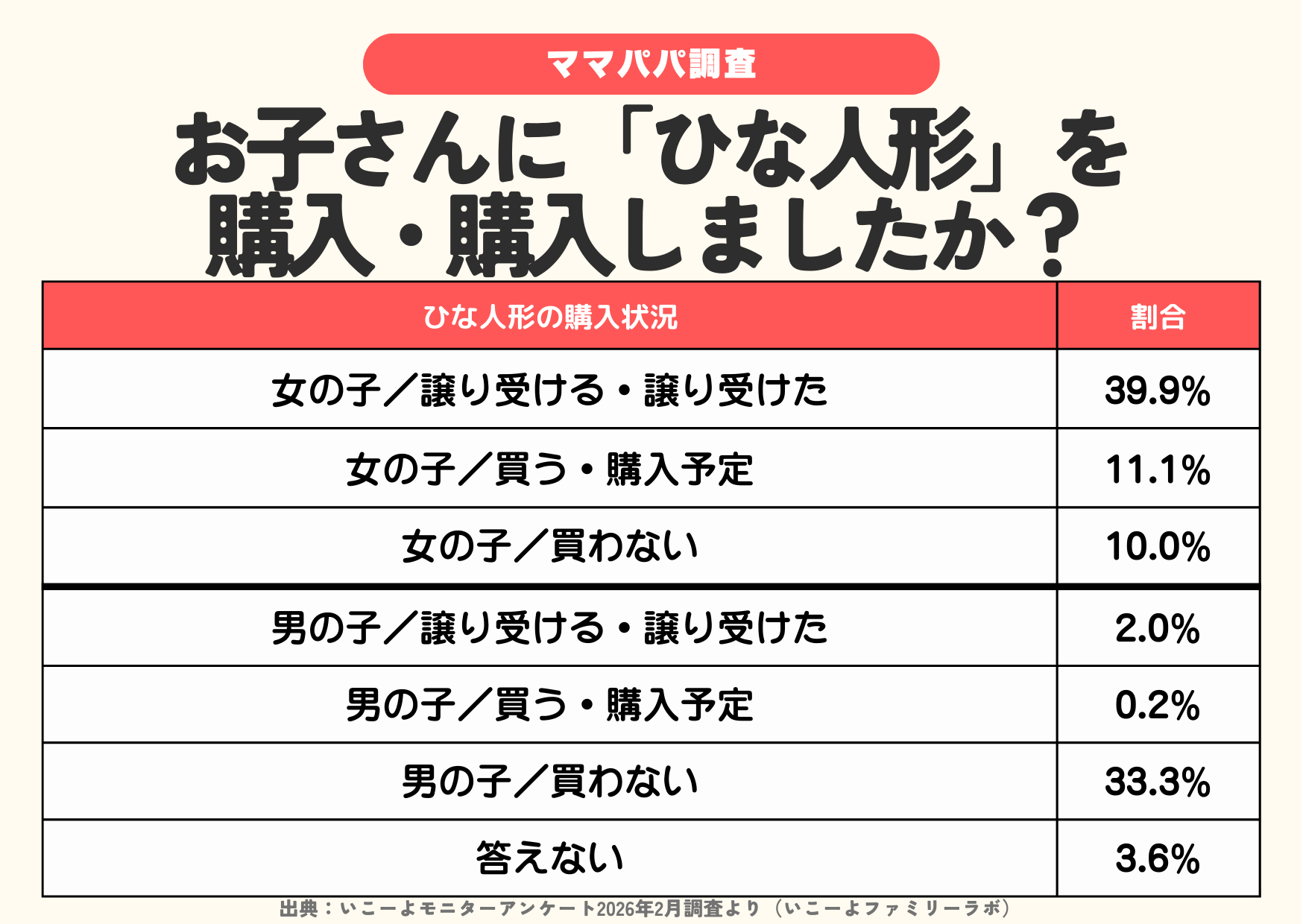 「お子さんに雛人形を買いましたか?」という質問では、以下の結果となりました。