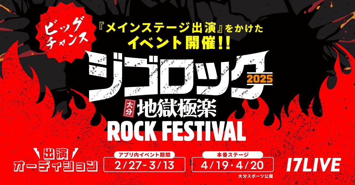 17LIVE株式会社(東京都渋谷区、代表取締役:ジャン・ホンフイ、URL:https://jp.17.live/)が運営する日本最大級のライブ配信アプリ「17LIVE(イチナナ)」は、大分県で4月に開催される大型音楽フェスティバル『ジゴロック2025~大分"地獄極楽"ROCK FESTIVAL~ supported by ニカソー』への出演者を選出する、「『ジゴロック2025』出演オーディション」を、2025年2月27日(木)より開催することが決定しましたので、お知らせいたします。
