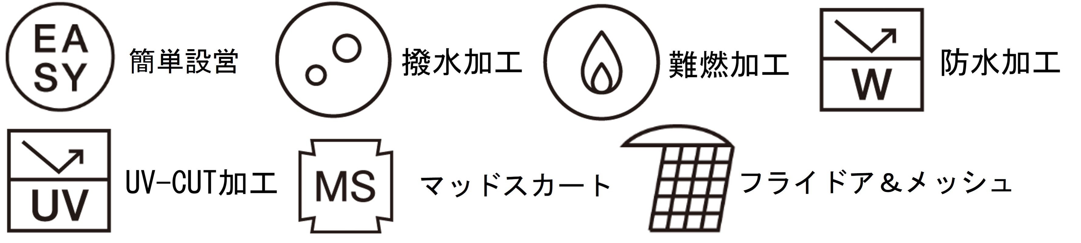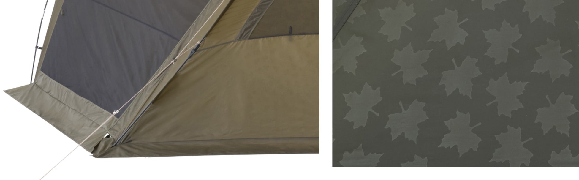 地面からの冷気や雨水、虫の侵入を防ぐフルマッドスカート仕様。フライシートにはメイプルリーフのエンボス加工を施し、表面が滑らかで軽量、かつ燃え広がらない「難燃性ポリタフタ」生地を採用。