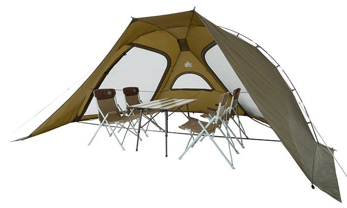 開口部は約5mの幅があり、背面は大きなメッシュ窓を設置しているので通気性と開放感も抜群です。 3人分のテーブルとチェアをセッティングしても広々で、メッシュ窓はオープンにするとストレスなく出入りが可能なので、快適なデイキャンプを楽しむのにぴったりです。