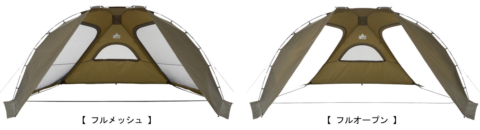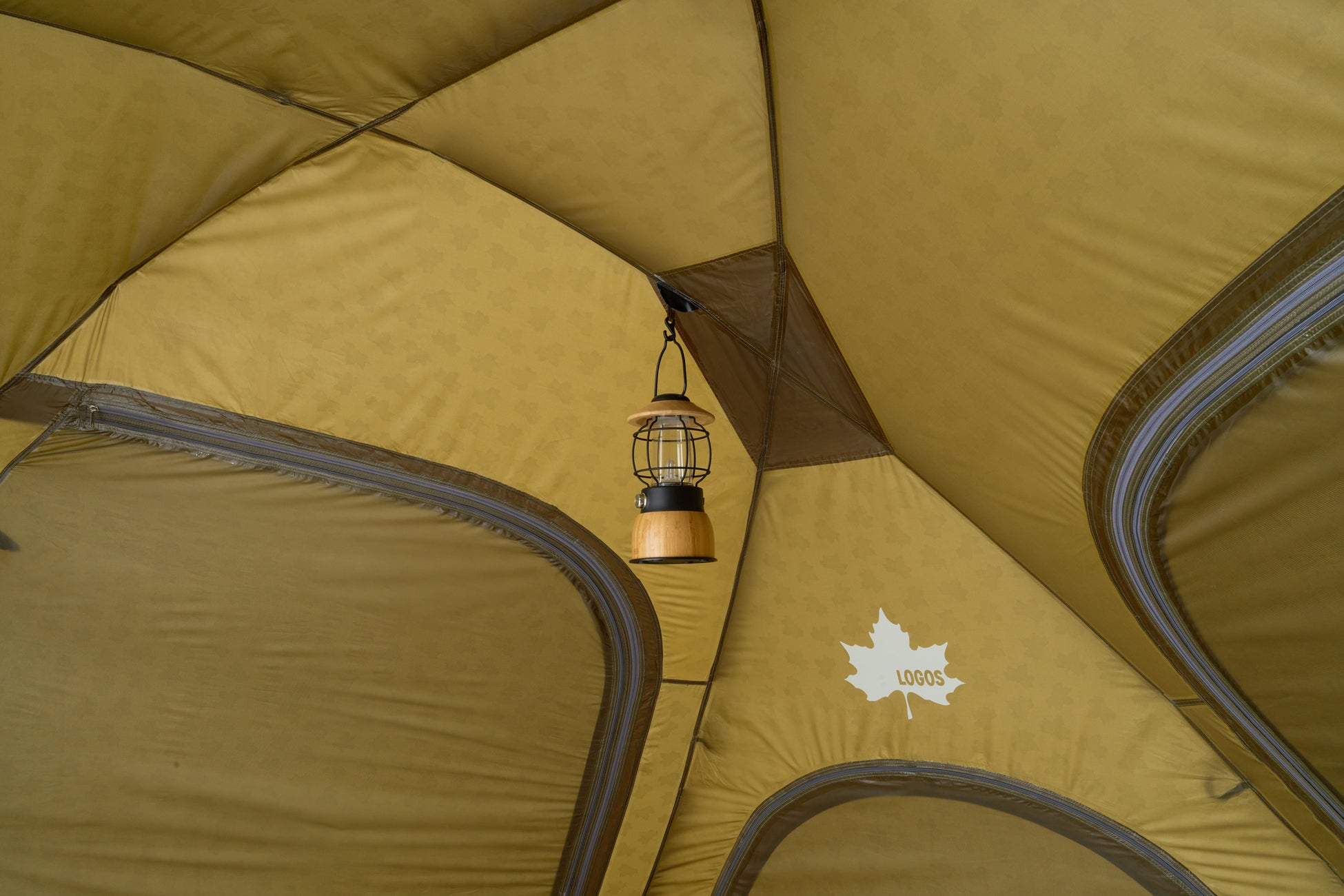 さらに、タープまわり下部の全面をガードするフルマッドスカート仕様で、地面からの冷気や雨水、虫の侵入を防ぐことができます。フライシートには、表面が滑らかで軽量かつ燃え広がらない「難燃性ポリタフタ」生地を採用し、メイプルリーフのエンボス加工を施しており、デザイン性も高く仕上げています。天井内側にはランタンを吊り下げられるフックも装備しています。