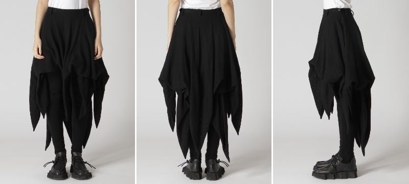 アシンメトリーシルエット、右裾に剣先ヘムのディティール、ベルトループ付、シームレスファスナー、2種類の格子状による編み込みの組み合わせ、ジャガード織り、縮絨加工で糸が柔らかく膨らみ、ランダムな粗野感やレースのような透け感を表現、断ち切りによる自然なほつれ、ウール