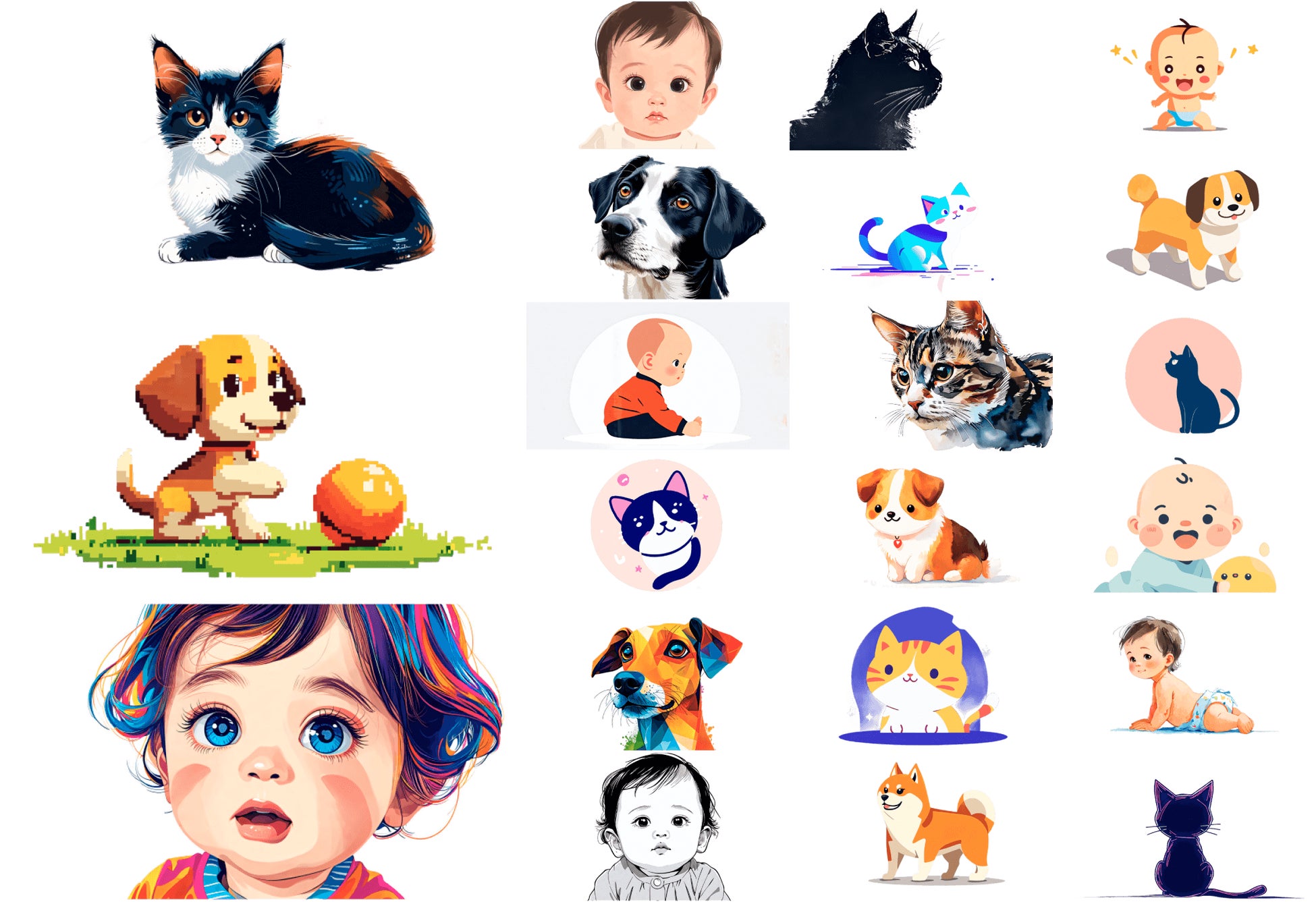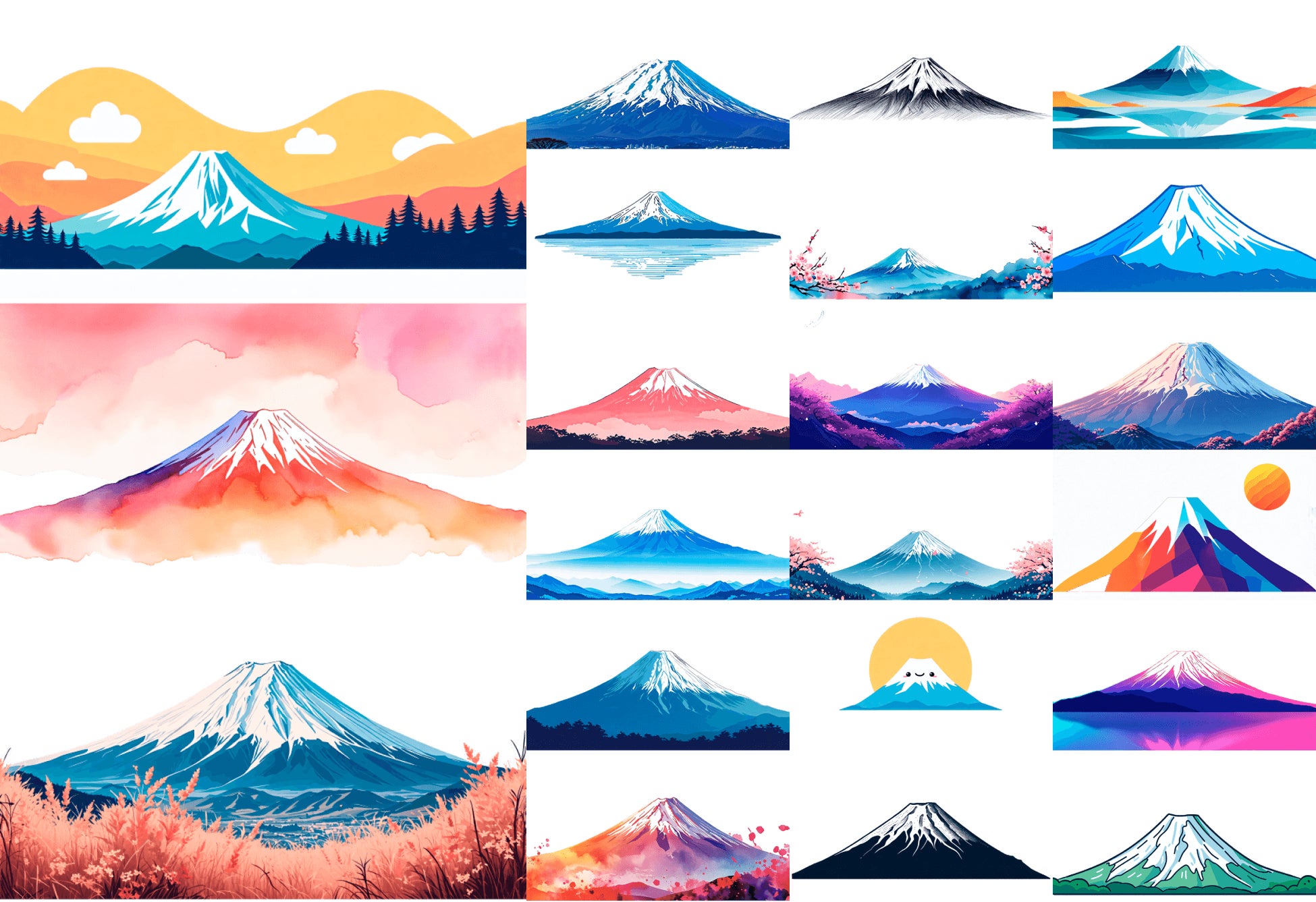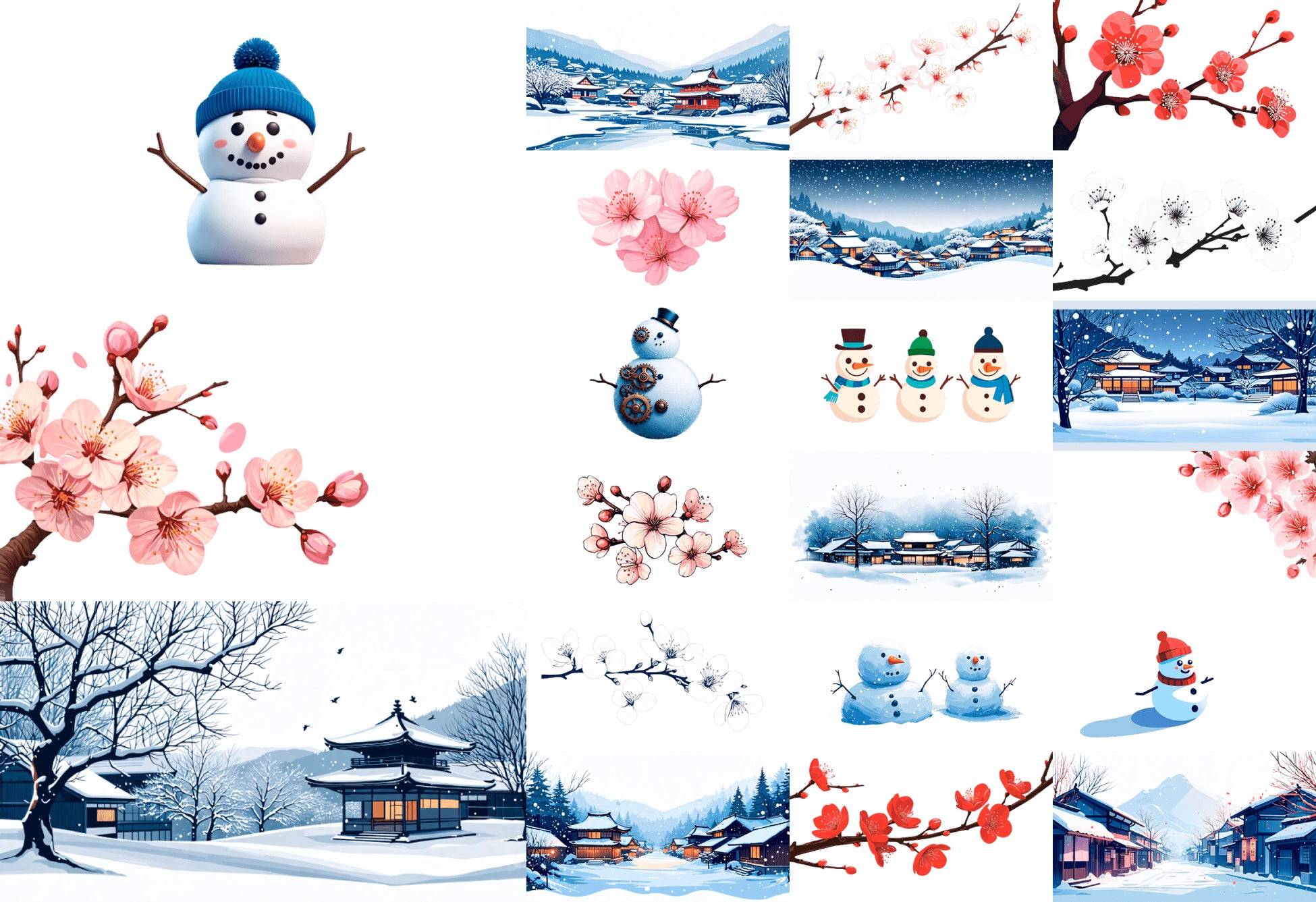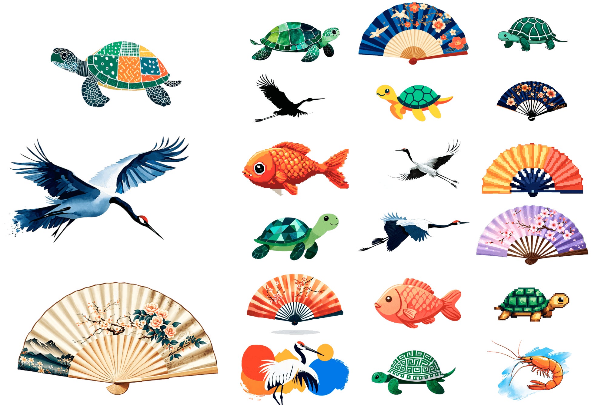 AIが作成したイラストから1,000点を厳選。高精細なものからシンプルなものまで、様々な画風の作品を収録しています。ほとんどのイラストは背景の透過処理がされ、他の画像の上にそのまま重ねることができます。筆まめや筆王などお持ちの年賀状ソフトですぐに使えます。