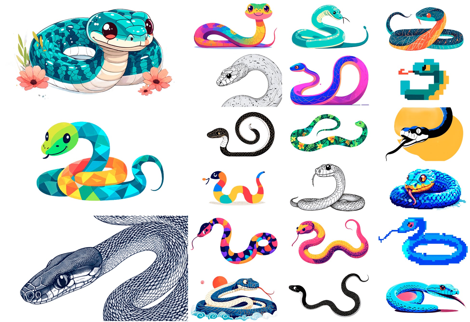 本製品は2025年の干支、巳年(へび)の年賀状に使えるイラストを収録した素材集です。