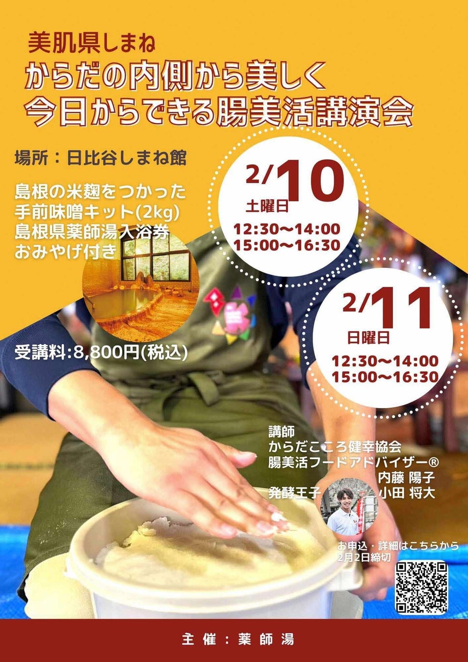 参加者には美肌県しまねの米麹をつかった手前味噌キット(2kg)、薬師湯入浴券、美肌エコバッグなどもプレゼント。
