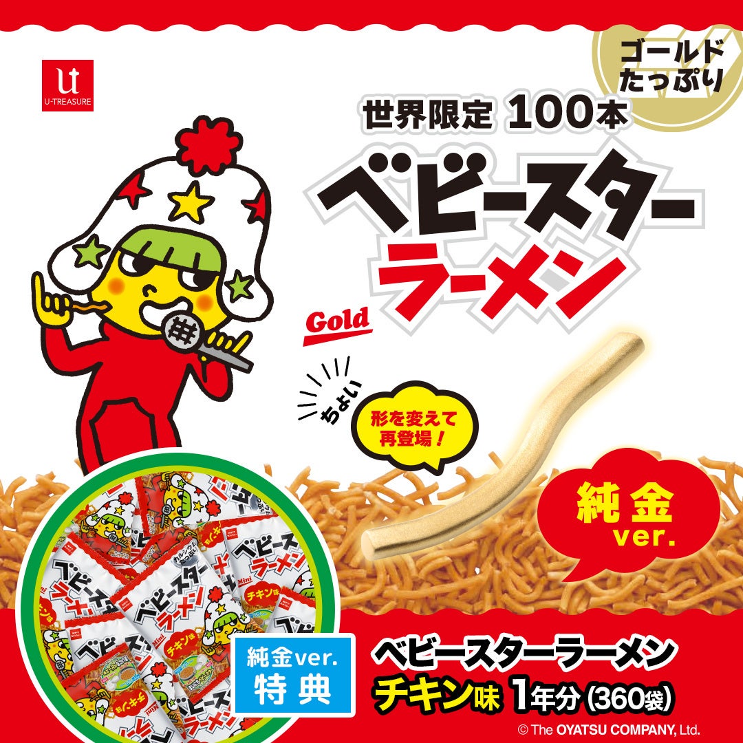 株式会社ユートレジャー(本社:東京都新宿区、代表取締役:伊藤 崇史)は、株式会社おやつカンパニー(本社:三重県津市、代表取締役社長:横山正志)のロングセラー商品「ベビースターラーメン」とコラボレーションした「純プラチナ 1/1 ベビースターラーメン(うましお味モデル)プラチナ999」と「純金 1/1 ベビースターラーメン(チキン味モデル)K24」を2024年8月2日(金)~9月4日(水)の期間限定で予約受付を行います。各100本の数量限定です。