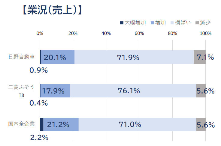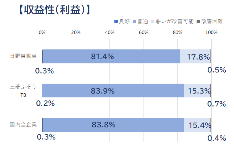 業況(売上)では、「大幅増加」傾向の企業の割合が日野自動車(構成比0.9%)、三菱ふそうTB(同0.4%)ともに1%を割り込み、国内全企業(同2.2%)と比べて低い。また、「減少」傾向の企業は、日野自動車のサプライチェーン企業で構成比7.1%となり、三菱ふそうTBや国内全企業と比較してもやや高い。収益性(利益)では、両社ともに国内全企業と概ね傾向が同じだが、「悪いが改善可能」の割合が17.8%と若干高い。エンジン認証問題のあった日野自動車のサプライチェーン企業は業況、収益性ともに若干苦戦を強いられていることが分かる。