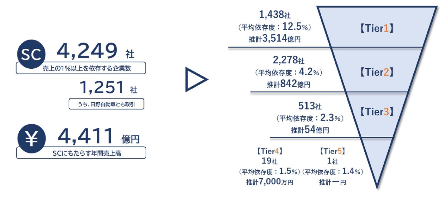 階層別に見ると、一次取引先(Tier1)企業は1,438社あり、自社売上高への依存度の平均は12.5%、もたらす売上高は3,514億円と全体の79.7%を占める。二次取引先(Tier2)は2,278社あり、平均依存度は4.2%で、もたらす売上高は842億円。日野自動車と比べTier1の社数が多くなっている。