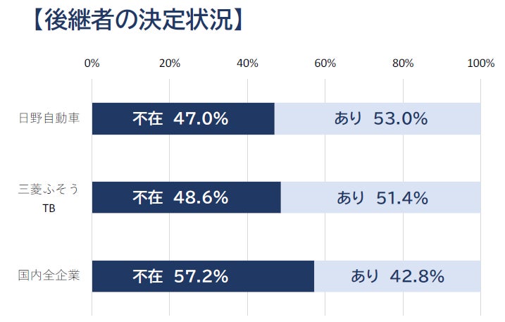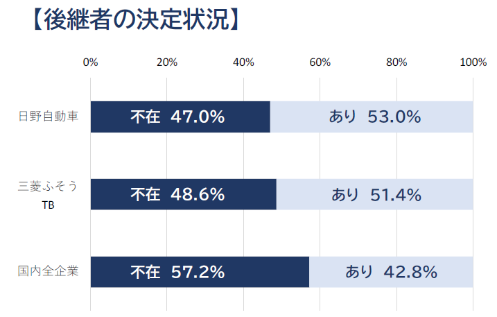 日野自動車、三菱ふそうTBともに後継者「あり」が「不在」を上回っており、国内全企業の後継者決定率42.8%を総じて10ポイント近く上回っている。それでも、約半数は後継者が決まっておらず、事業継続には一定の憂慮もある。