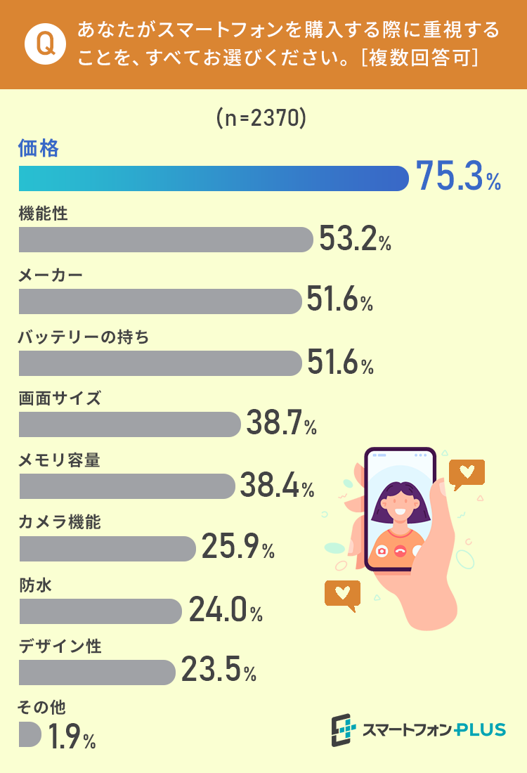 スマートフォンを購入する際に何を重視するかという質問では、「価格」と回答した方が75.3%ともっとも多い結果になりました。