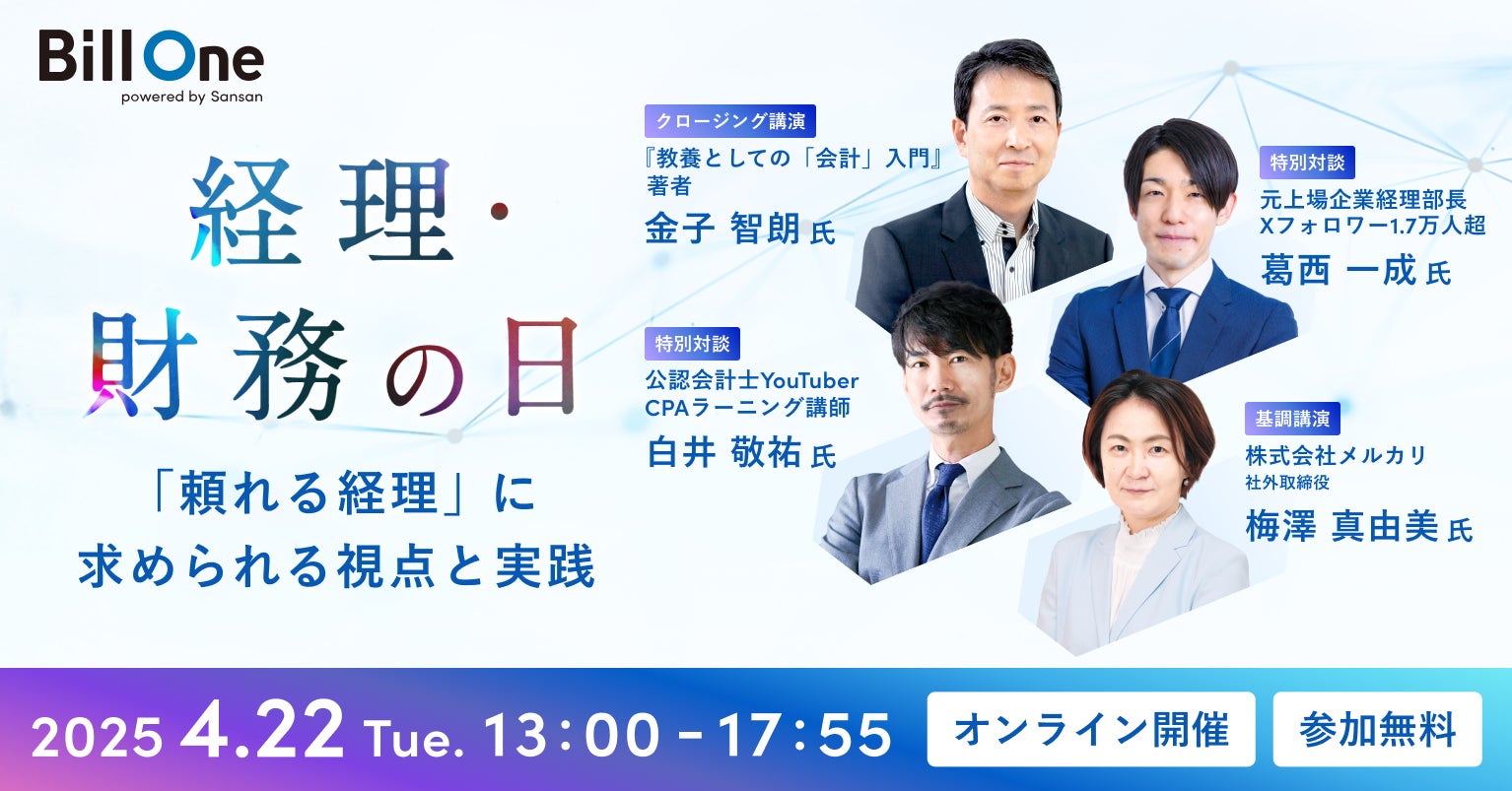 Sansan株式会社が提供するインボイス管理サービス「Bill One」は、ビジネスイベント「経理・財務の日~『頼れる経理』に求められる視点と実践~」を、2025年4月22日(火)13:00よりオンラインで開催いたします。