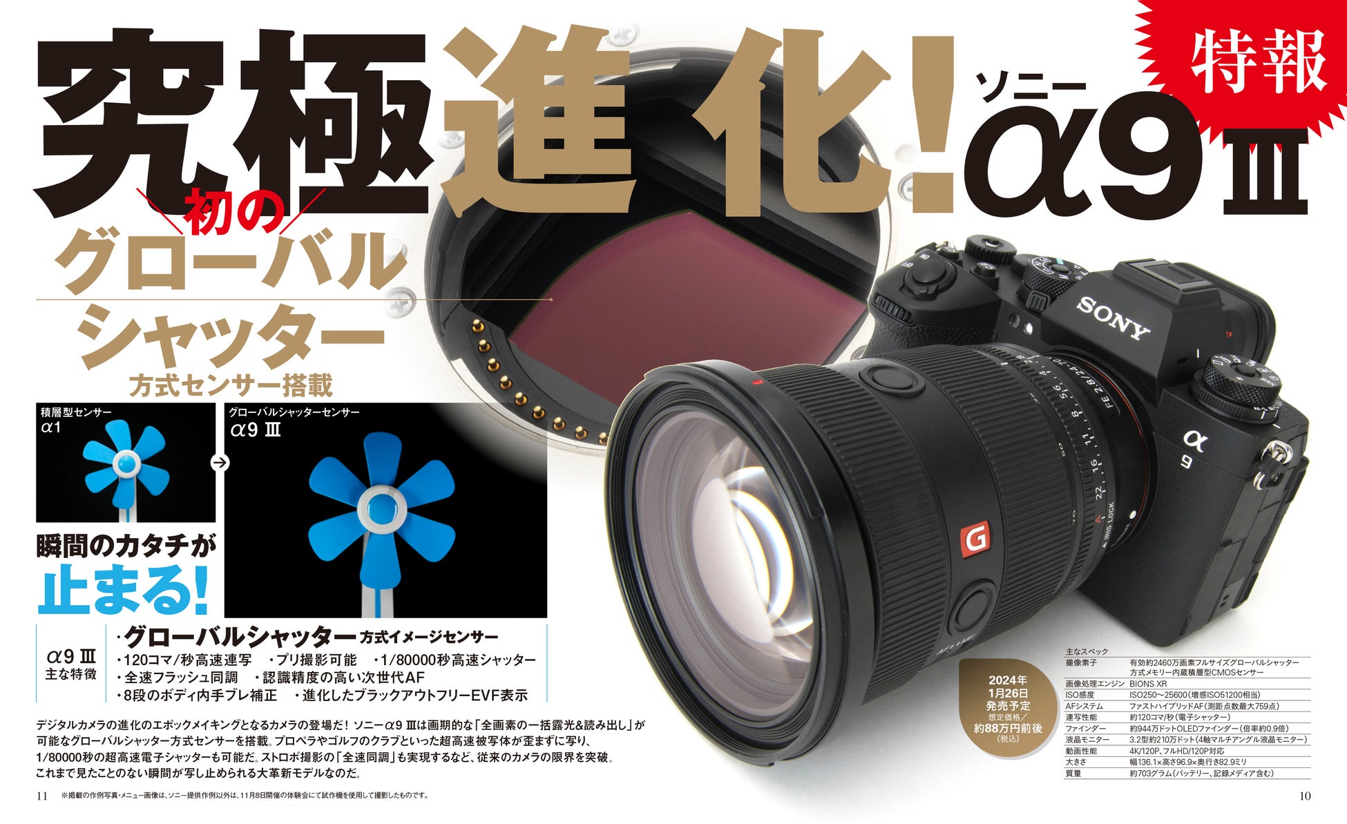 【11月20日発売】特集はカメラ・レンズ・撮影用品「2023年末お買い物ガイド」。本誌イチオシの製品を一挙大公開。さらに、究極進化のソニー「α9Ⅲ」が鮮烈デビュー! 速報でお届けします。