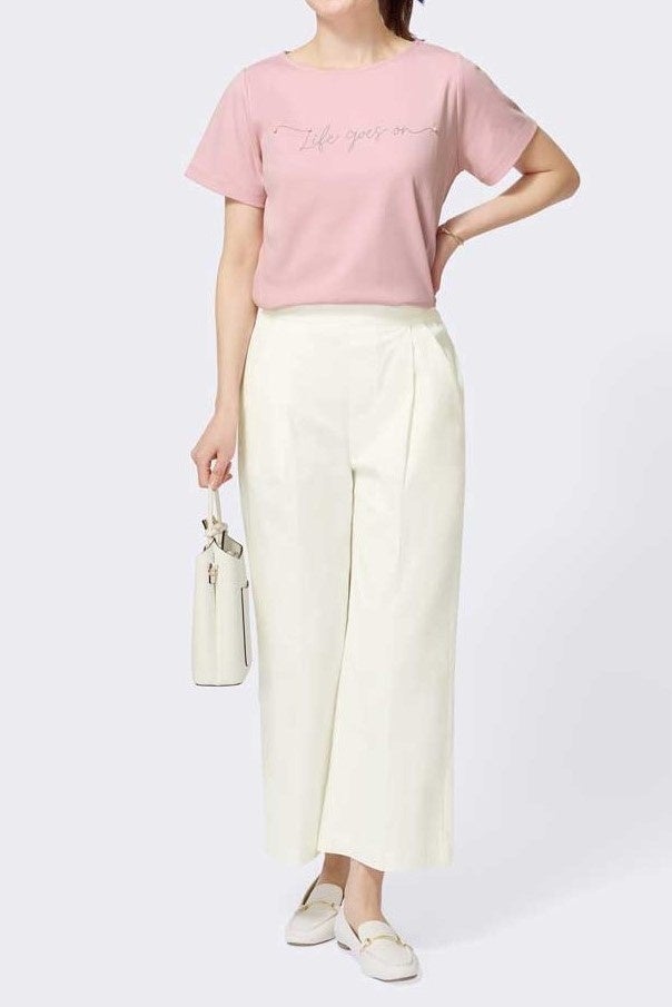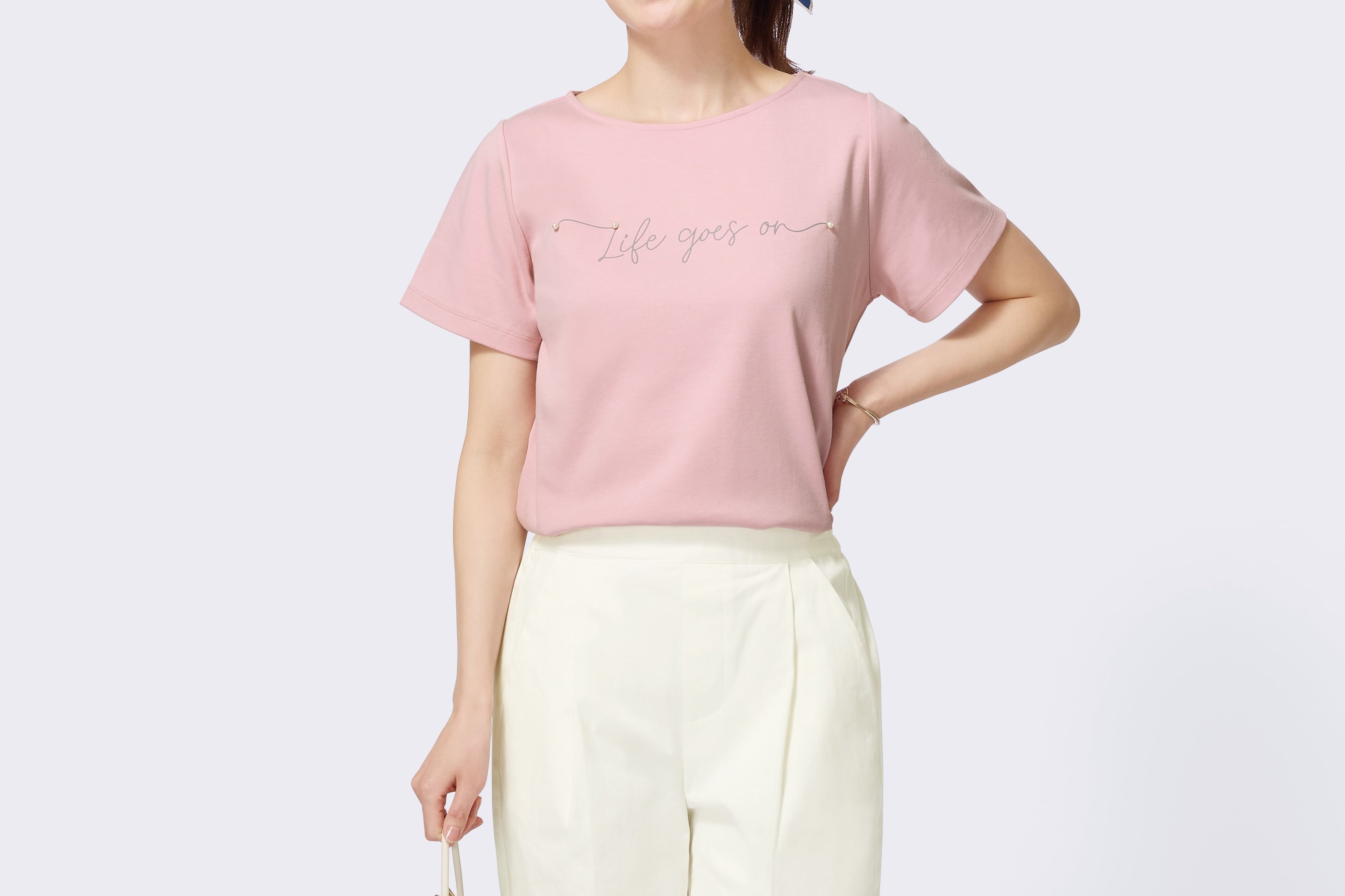 <商品名>フェイクパール付きロゴTシャツ