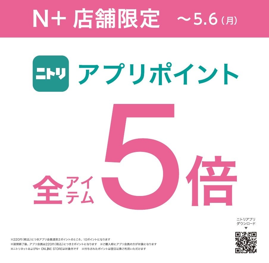 N+ 全店で実施 ニトリアプリ会員キャンペーン(期間:5⽉6⽇(月)まで)
