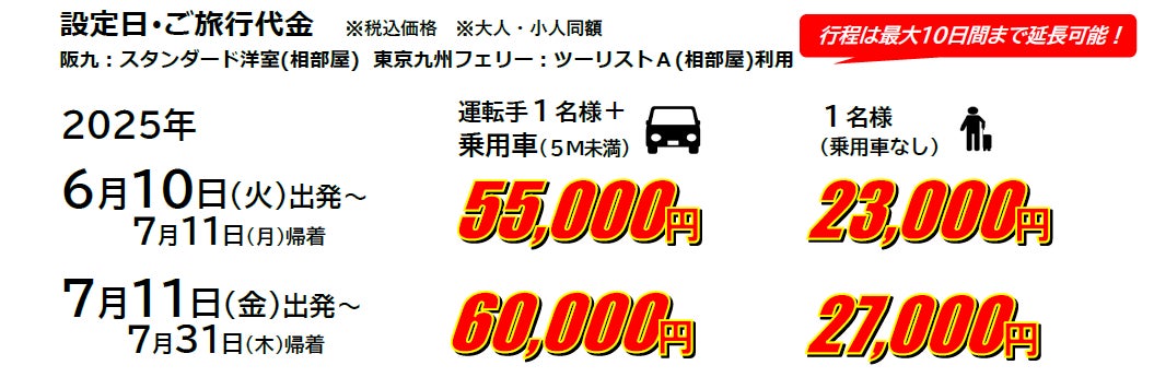 関西出港~関東帰着は最大10日間まで延長可能で九州も満喫できる商品です。