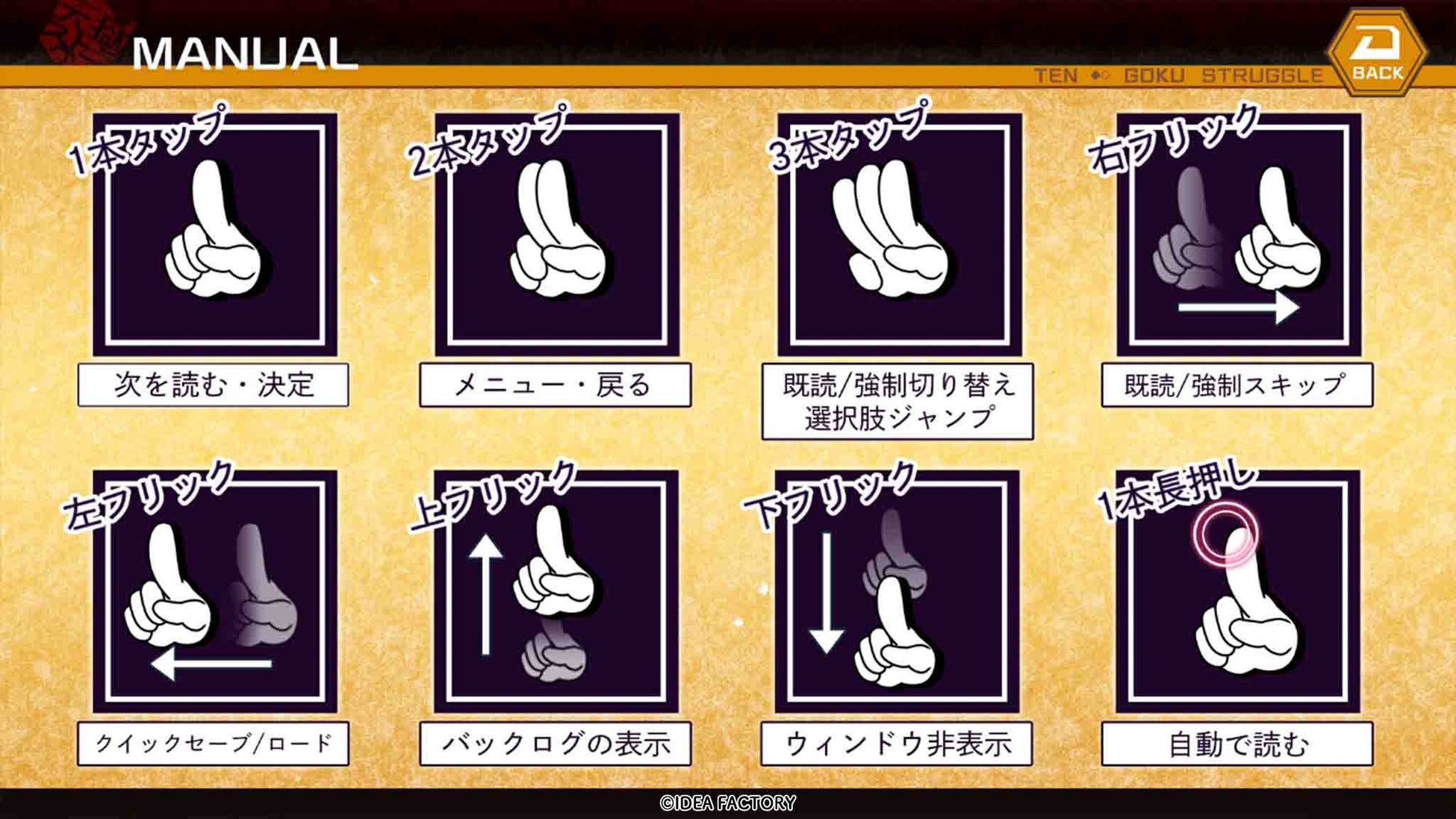 既読/未読スキップ/選択肢ジャンプ/オートモードや、クイックセーブ/ロード、巻き戻し機能など、快適にプレイできるシステムを搭載しています。