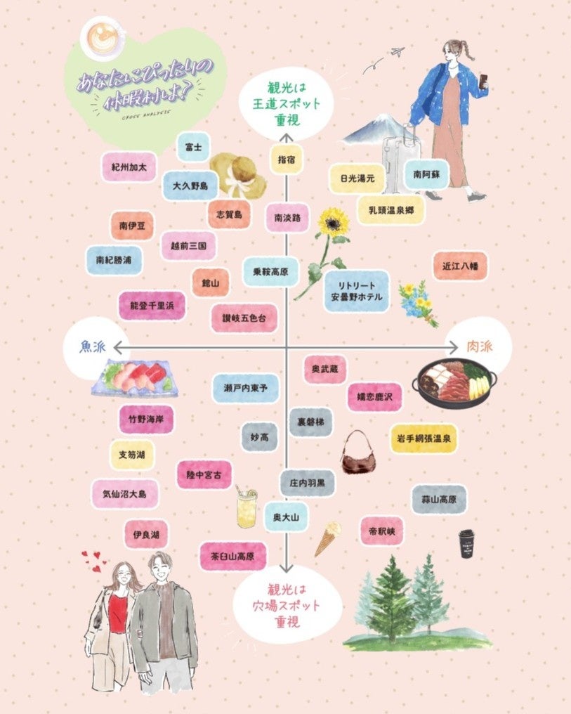 観光スポットを選択する際、【王道スポット派or穴場スポット派】、グルメは【魚派or肉派】の軸で、全国の休暇村を配しています。