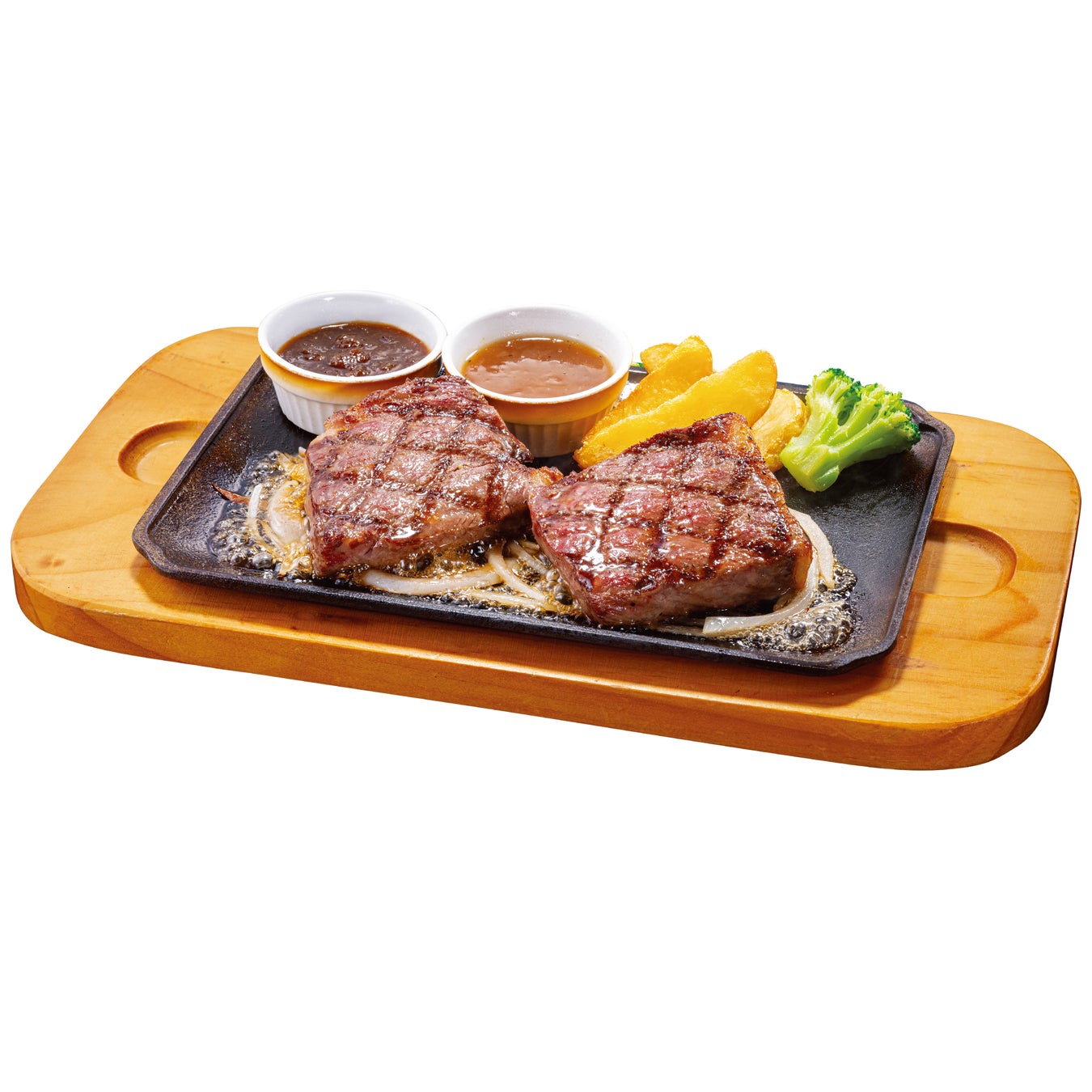 「国産牛サーロインステーキ」は、赤身と脂身のバランスが良い国産牛のサーロインを300℃の高温直火で焼き上げた期間限定商品です。今回使用する国産牛のサーロインは、柔らかい肉質と上質な甘さの脂が特長です。直火で焼き上げた後、オーブンでじっくり火を通しており、ジューシーでとろけるような味わいをお楽しみいただけます。お好みで選べる2種類のソースを付けてお召し上がりください。