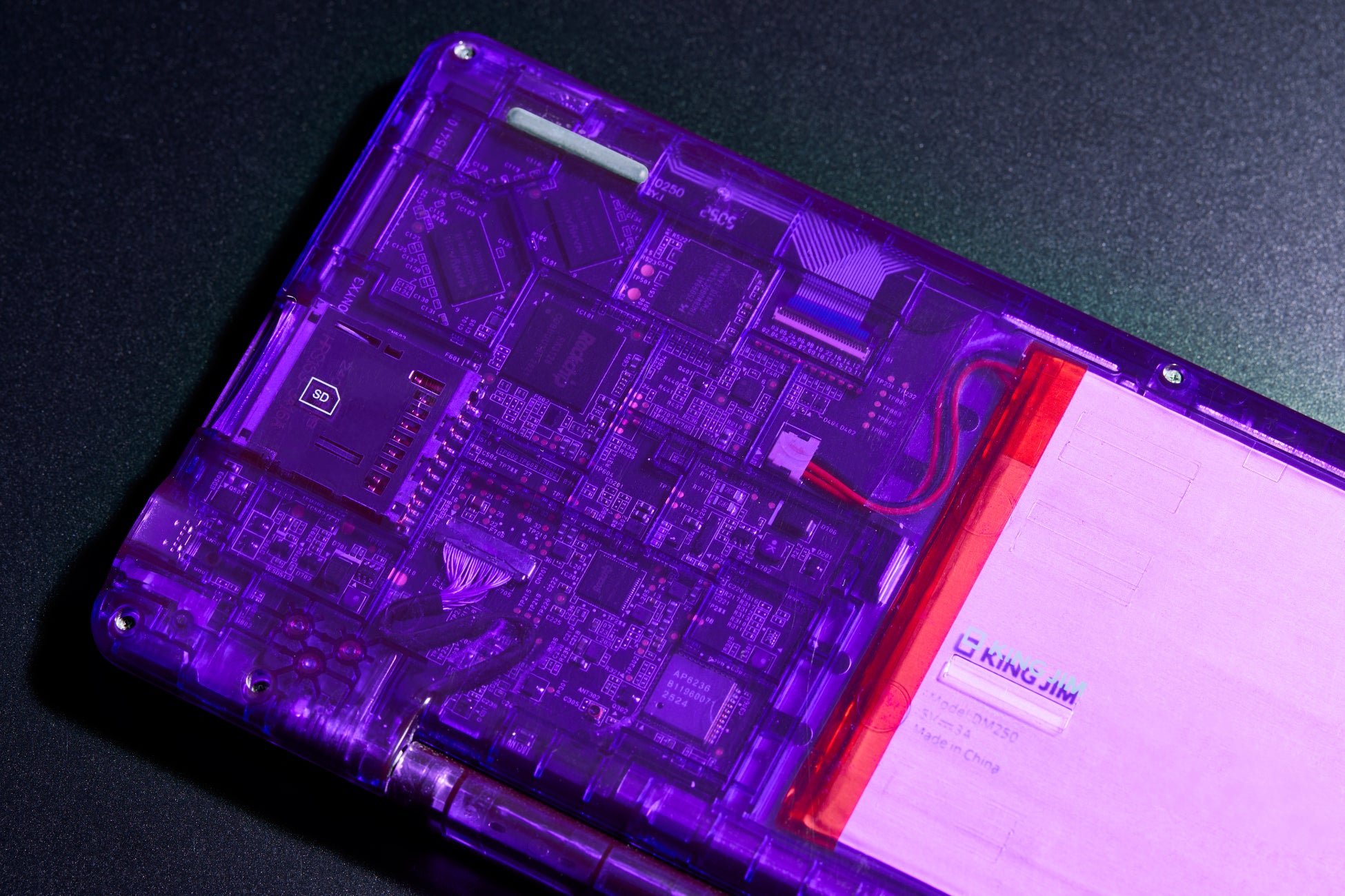 これまで特別仕様の「ポメラ」は複数回発売してきましたが、そのたびにご好評をいただき、毎回完売となる人気企画となっています。今回のDM250XYZ Midnight Purpleは、「ポメラ」の現行モデルであるDM250をベースに、落ち着きのある深いパープルの透明ボディを採用。うっすらと透ける内部基板が奥行きを感じさせ、深みのあるパープルが大人の「ポメラ」ファンのコレクター心を刺激するデザインとなっています。また、DM250XYZ Midnight Purpleのロゴをあしらった「限定アクリルキーホルダー(ロゴタグ)」を本製品の購入特典として同梱しています。今回はキングジム公式オンラインストアにて500台限定で抽選販売します。